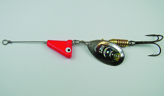 Körperformen Auf der Spinnerachse bendet sich zwischen dem Blatt und der Öse für den Drilling ein fester oder beweglicher Körper. Achskörper gibt es in allen erdenklichen Varianten, wobei sie in unterschiedlicher Weise die folgenden Aufgaben erfüllen: 1. Abstand halten zwischen Gelenk (und damit Blatt) und Drilling. 2. Stabilisierung der einfachen Drahtachse. 3. Beschwerung des Spinners, dadurch Einuss auf Flugverhalten und Lauftiefe. 4. Unterstützung der Druckwellen durch bestimmte Form und Struktur. 5. Optische Wirkung durch Farbe oder Reektion des Lichts. 6. Akustische Wirkung durch Klang beim Zusammenspiel einzelner Körperbestandteile. Vorschalten Bleikopf-Spinner sind eigentlich schon ganz andere und eigene Modelle. Aber mit separaten Bleiköpfen bestehend aus Draht und dem eigentlichen Bleikopf kann man jeden Spinner zu einem schwergewichtigen Weitwurf-Spinner aufrüsten. Der vorgeschaltete Bleikopf macht den Spinner nicht nur schwerer, sondern verstärkt auch seine Wasserverdrängung. Das macht ihn auffälliger und interessanter für größere Raubsche.