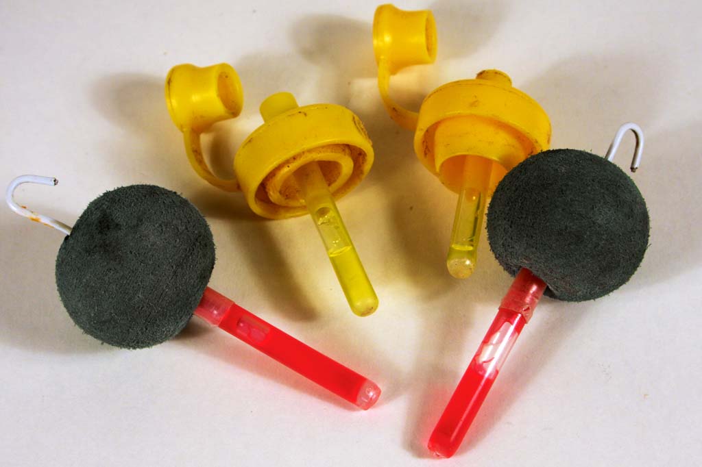 Diese federleichten Eigenbau-Einhänger bieten den Zandern den geringsten Widerstand beim Schnurabzug: Verschlüsse von Spüli-Flaschen (Mitte) und Schaumstoffbälle in die oben der Draht einer Büroklammer eingenäht wurde. Foto: BLINKER/D. Charman