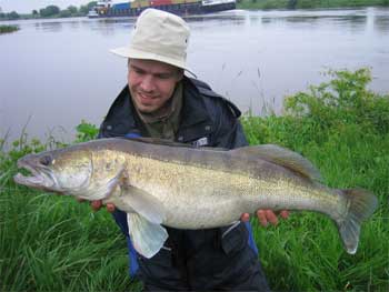 Eine lange Schonzeit war endlich zu Ende und es sollte ein richtig guter Saisonstart 2006 werden. Nachdem noch schnell ein kleiner Snack eingenommen war, stand ich um 4:30 Uhr am Wasser. An diesem Tag begleitete mich mein Brunder, der extra zum gemeinsamen Pfingst-Zanderfischen aus Süddeutschland gekommen war. Tatort: Weser – Ich hatte mir für heute Morgen ein recht abseitsgelegenes Buhnenfeld ausgesucht. Das Wetter spielte mit – bedeckt, ganz leichter Wind aus West und Nieselregen bei 10 Grad. Nach ein paar abgesuchten Buhnenköpfen konnte ich leider noch keinen Kontakt feststellen und ich begann, mit den Ködern zu experimentieren. Schließlich war ich, wie schon so oft, in meiner Köderkiste auf einen kleinen 8cm Slottershad in blau/weiß gestoßen. Schnell montiert am 12gr-Erie-Kopf und los gings. Erster Wurf, zweiter Wurf, dritter…, was war das? Ein Kurzes Stoppen des Köders in der Absinkphase, die eigentlich noch gar nicht vorbeisein konnte. Ich reagierte sofort mit einen Anhieb und stieß auf mächtige Masse unter Wasser. Durch die Geflochtene hatte ich beim Anhieb zuerst das Gefühl, einen Hänger angeschlagen zu haben, da sich für wenige Zentel Sekunden gar nichts bewegte, bis plötzlich Leben in die Sache kam und sich der Fisch kopfschüttelt und zanderlike kopfstoßend in Bewegung setzte. Es war, als wenn ich ein U-Boot gehakt hätte, aber plötzlich kam der Fisch an die Oberfläche und ich sah beim walähnlichen Abtauchen eine mächtig breite Schwanzflosse. Ab diesem Zeitpunkt ging alles sehr schnell. Der Zander ließ sich für 2-3 Sekunden heranziehen, um kurz vorm Kescher nocheinmal die Rolle aufheulen zu lassen und erneut 5 Meter von der Spule riss. Der Drill war recht kurz, wie ich schon öfter bei Zandern um die 75-85cm feststellen konnte und dann war es soweit, der Kescher war viel zu klein mit seinem Öffnungsmaß vom 60cm, aber ich fädelte den Fisch in einem geeigneten Moment von vorne ein und zog ihn mehr als daß ich ihn heben konnte vorsichtig an Land. Da lag er nun und meine Freude hatte keine Grenzen. Ein Pracht-Zander mit stolzen 96cm und einem Gewicht (ich hatte die Digitalwaage im Rucksack) von 9580 Gramm. An diesen Fisch werde ich mich wohl noch lange erinnern. Auf jeden Fall grinse ich jetzt noch übers ganze Gesicht. Petri an Alle! Michael Bruns
