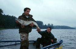 Nu war aber „Holland in Not“!! Andreas, der noch nie in seinem Leben einen solchen Hecht an der Angel hatte, wurde recht nervös und der Hecht meinte er müsse unter der Ankerleine durch, doch Andreas schaffte es ganz hervorragend, alle Fluchten des Fisches teilweise mit der Rute unter Wasser so abzufangen, dass ich den Hecht sicher mit meiner noch intakten linken Hand greifen konnte