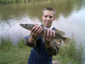Also, als wir im Centerparks angekommen waren packte ich natürlich als erstes meine Angeln aus, ich versuchte mein Glück zuerst mit einer Spinnrute, welche mit einem 3er Mepps bestückt war. Leider biss nach einer halben Stunde noch kein Fisch, was mich erst etwas wunderte. Also dachte ich mir, Naturköder wäre in diesem Fall etwas besser. Ich packte meine Stippe aus und fischte etwas auf Weißfisch, nach einiger Zeit hatten sich dann auch einige Köderfische angehäuft. Ich bestückte meine Angel, welche mit einem Drennan Laufschwimmer und einem Stahlvorfach bestückt war mit einem ca. 10 cm großen Köderfisch. Den Köderfisch Köderte ich mit der Maulköderung an. Da es in diesem Gewässer sehr flach war, ca. 1,50m stelle ich die Pose sehr niedrig ein. So, nun hieß es abwarten, ich fütterte mit Anfütterfutter an meinen Schwimmer an, denn da wo kleine Fische hinkommen, kommen auch die großen Fische hin. Ich wartete und wartete und dann kam der Biss, und es war ein richtiger Biss ohne Vorwarnung, Die Pose tauchte in einem Ruck ab und der Fisch ging damit. Ich schlug schnell an, da ich nicht wollte, dass der Fisch schluckt, denn ich bin ein Fan von fangen und wieder frei lassen. Trotz dem schnellen Anschlag saß der Haken scheinbar gut. Ich konnte den Fisch nun nach einigen Minuten sicher im Netz landen. Der Haken hing ziemlich weit vorne, sodass ich ihn ohne Probleme lösen konnte. Dass stolze Resultat des ersten Fisches 55cm, ist zwar noch recht klein für einen Fisch, aber es war ja der erste an diesem Wochenende. Am nächsten Tag stand ich extra um 5.30 auf, um die großen Hechte zu überlisten. Als ersten fing ich mir ein paar kleine Köderfische, was um diese Uhrzeit relativ schnell ging. Ich beköderte wieder die selbe Rute mit einem Köderfisch und warf sie nur ca. 5 Meter vom Rand entfernt aus. Gerade als ich mich hingesetzt hatte kam der Biss, der Biss kam ganz vorsichtig. Die Pose wanderte nur ganz langsam. Es kam mir vor als wenn der Fisch den Köder nur begutachten würde, deswegen wartete ich diesmal etwas länger mit dem Anschlag. Der Köder schien dem Hecht wohl zu gefallen, denn plötzlich wanderte der Schwimmer rasend schnell dem Schilf zu, das war der richtige Moment für den Anschlag. Der Haken saß, ich merkte sofort in den ersten Sekunden,. Dass dieser Fisch größer war. Es gelang mir erst nach einiger Zeit den Fisch an die Oberfläche zu hiefen. Und es war wieder ein Hecht, ich schätze ihn anfangs auf einen knappen Meter. Glücklicherweise konnte mein Vater den Fisch suverän landen. Und da war er, der größte Hecht meines Leben, er hatte leider den haken recht tief geschluckt, deswegen beschloss ich das Vorfach abzuschneiden. Der Hecht war genau 92cm groß, fast ein Meter Hecht, aber der kommt bestimmt auch noch. In den nächsten Tagen folgten dann noch 2 weiter Hechte, welche zwischen 54 und 69cm lagen. Einen der beiden konnte ich mit einem Spinner überlisten, und den andern fing ich ebenfalls mit Köderfisch.