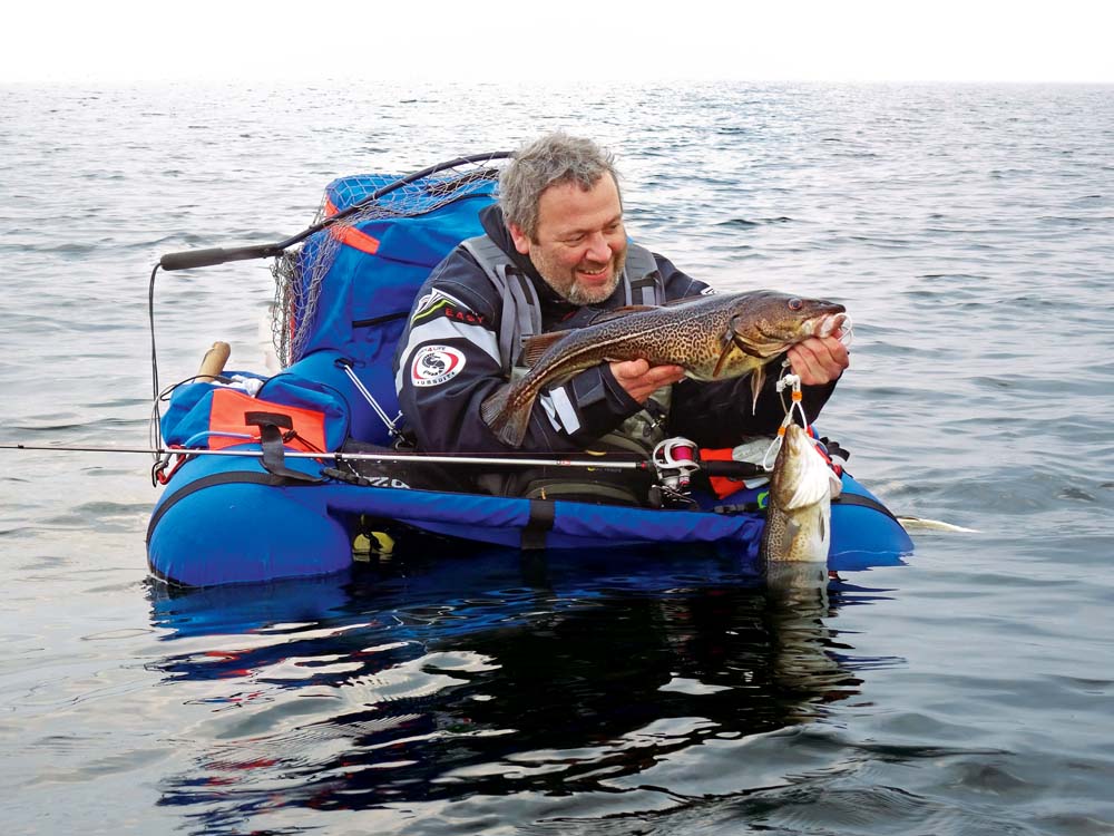 Ich habe schon von 200.000-Euro-Booten aus geangelt, von „Big Game“-Yachten, von amerikanischen Bass-Booten mit zweimal 250 PS am Spiegel! Aber ganz ehrlich: Das Fischen vom Belly-Boot im Frühjahr in der Ostsee auf Dorsch und Meerforelle ist für mich eine der geilsten Angelarten überhaupt. Warum? Weil ich so fein fischen kann, dass der Drill mit einem 50er Dorsch das wird, was er sein sollte: spannend, kraftvoll und gut. Dafür setze ich sehr feinnervige Ruten bis zwei Meter Länge ein, mit Wurfgewichten, die zwischen fünf und 25 Gramm liegen. Die Aktion darf etwas straffer ausfallen, um den Köder kontrolliert führen und einen herzhaften Anhieb setzen zu können. Ich fische in Tiefen zwischen vier und zwölf Metern, die Jigköpfe sind zwischen zehn und 30 Gramm leicht – je nach Strömung.