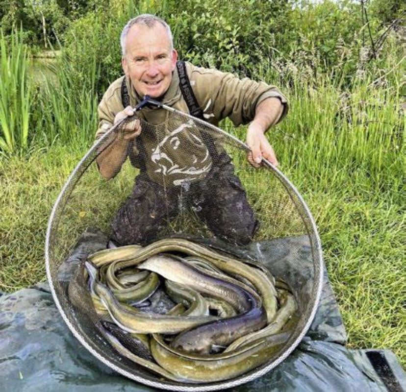 Diese Masse an Aalen fing Duncan an einem kommerziellen Angelteich. Die Fische wurden schonend gehältert und nach dem Fangfoto zurückgesetzt.