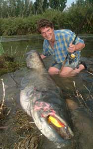 Vorzeichen standen leider sehr schlecht, denn unsere Vorhut hatte laichende Waller gemeldet und die letzten Tage auch eher schlecht gefangen. Trotzdem machte ich allen Mut, denn bewusst habe ich diese Woche wegen des bevorstehenden Vollmondes als Termin ausgewählt: Ende der Woche fangen wir am besten, sagt mein Apparat! Alle grinsten, einige kannten ja schon meinen tiefen Glauben an dieses Teil und waren gespannt… Dieser Eindruck bestätigte sich auch bei meiner Ankunft, denn gleich 2 Tage hintereinander holte ich mir einen astreinen Schneider ab, wenn auch gleich zu Beginn ein Horrordrill für Hoffnung auf große Räuber sorgte: Biss, rasante, nicht zu bremsende Flucht mit plötzlichem Ausstieg des Fisches zeigte die Dicken sind da! Bodo guidete täglich ein Team auf einer neuen, entlegenen Strecke, auf der offensichtlich keine Fische laichten. Sie bissen dort munter, so dass zumindest die Angler dort schnell auf ihre Kosten und zu ihren Wallern kamen. Die Fischgrößen dort waren von 1 1,8 Meter für viele von uns schon phantastisch, aber auf unserer Hausstrecke mit den bekannten Monstern für die Spinnrute blieb es leider auffällig ruhig. Wir drifteten am Tag 3 durch den Fluss und endlich schienen die ersten Waller wieder munter zu werden. Hier ein Biss, dort ein Fisch und endlich auch mal ein längerer Großfischkontakt ließen unsere Erwartungen in die Höhe schnellen. Dieser Großfisch war leider im Schwanz gehakt, aber bei 2,20 Metern war der Drill umso wilder und Christian, der ihn drillte rief immer nur: Der zieht mich rein, der zieht mich rein! Seine Monsterpin hielt er anfangs nur waagerecht, weil der Fisch wie eine Langstreckenrakete durch das Wasser schoss. Gespannt und erschöpft konnten wir den Fisch dann aber doch nach längerem Drill landen. Ein Schlammbad fürs Foto war dann auch noch drin… Die Folgetage wurden immer besser: Pro Drifttour konnten wir fast immer 2-5 Fische landen und auch zunehmend tolle Bisse verzeichnen. Auch zu Fuß gab es Bisse und auch einige schöne Fische. Eines Morgens war ich mit Marius unterwegs und wir sahen Scharen von laichenden Karpfen. Mitten drin plötzlich ein auffällig großer Fisch: Das ist aber kein Karpfen rief ich und watete ihm entgegen. Der Wels hatte schnell etwas bemerkt und ließ sich unter das Kraut sacken. Ich blieb ca. 10-15 Minuten ruhig in Wurfweite entfernt stehen, als sich dieser Wels wieder an die Oberfläche begab und sogar auf mich zu schwamm… Ein leichter Schlenzwurf traf genau die 12 und es machte ein lautes Plöpp der Gummifisch war sofort im Maul verschwunden. Anhieb und eine monströse Wasserexplosion folgten fast zeitgleich. Der Fisch flüchtete in Nullkommanix 15-20 Meter durch das Kraut und bog auch noch ab. Nichts ging mehr! Nach kurzer Verschnaufpause raste der Waller wieder los und es machte ein besonders lautes Peng ich hatte schon den 2. 2 Meter+-Fisch versemmelt… An diesem Abend wechselte ich meine Schnur von Tragkraft 65 auf 80 Lbs. Sicher ist sicher! Erst am darauf folgenden Tag sollte es dann endlich passieren: Auf einen tief geführten Gummifisch biss in einem Stillwasserkolk ein herrlicher Dickfisch mit 2,02 Metern Länge. Es war das erste beißende 2 Meter-Monster, das die Monsterspin besiegen konnte! Kleinere Exemplare mit 1,82 Metern und darunter waren ebenfalls dabei. Es fiel richtig auf, dass täglich eine extreme Zunahme der Beisserei festzustellen war! Unser Team aus Bayern hatte sich zwischenzeitlich mit Bodo verbrüdert und zog das Ansitzangeln mit Bojen oder Pellets vor. Sie fingen ausgesprochen gut und konnten am Abend dann sogar einen 2,20er Fisch vermelden. Alle waren begeistert, weil eine echte Dramaturgie in den Tagen steckte. Ob wir uns noch steigern konnten? Es ging, denn am Folgetag fing unser Bayernteam sogar noch einen fetten Albino und der wurde typisch bayrisch mit ordentlich Bier gefeiert! (Bilder liegen mir leider noch nicht vor reichen wir vielleicht nach). Christian und ich schafften es sogar, von einer Stelle gleich 2 Waller wegzuzupfen und es gab einen Doppeldrill mit doppelter Monsterspin! Dieses Kunststück ist uns erst einmal in 3 Jahren Spanienbesuch gelungen. Es war inzwischen Freitag geworden und es hatte inzwischen bei allen Teilnehmern gewallert. Den Morgen starteten wir 7 Uhr früh in der Dämmerung schienen unsere Waldis noch etwas müde zu sein, jedenfalls hatten wir die ersten Bisse immer erst ein bis zwei Stunden nach der Dämmerung bekommen. Dieser Morgen schien schwierig zu sein, denn die ersten Top-Stellen blieben alle ohne Biss! Wir trieben recht zügig in einen Stillwasserbereich und mein rot-gelber Gummifisch platschte hinter ein Krautfeld mit offensichtlich tieferem Wasser dahinter. Tief sinken konnte er aber nicht, denn das wurde durch einen mächtigen Schlag in meine Rute abrupt abgebrochen. Ein Anhieb und ein echtes Monster knallte aus dem Wasser: Der ist riesig! schrie Marius und ich war mir auch sicher, dass es ein sehr großer Fisch war. Christian übernahm die Ruder und meinte: Der hat 1,80m! Ich konzentrierte mich auf den Drill und wollte jetzt nicht mit ihm diskutieren, wie groß der Fisch jetzt wirklich war. Jedenfalls blieb er eine ganze Weile verschwunden. Christian manövrierte uns entsprechend meinen Hinweisen durch den Fluss und immer wieder wurde es eng. Mal zog uns der Fisch, mal zogen wir den Fisch. Es ging dicht am Holz vorbei und 2 mal auch durch das Kraut, als ein echter Monsterschädel erstmalig an der Oberfläche auftauchte: Der ist aber ganz locker über 2,10 Meter! rief ich jetzt zu Christian. Schlecht gehakt ist der auch noch! Da müssen wir sehr vorsichtig sein! Der Fisch hing ziemlich blöd unter der Gaumenplatte und es sah so aus, als würde der Gufi gleich aus dem Maul herausfallen. Eine echte Zitterpartie begann! Endlich kamen wir auch wieder in ruhigeres Wasser, nachdem wir gut und gerne 1 Kilometer mit Fisch im Drill abgetrieben waren. Einige Male auf und ab und dann konnte ich endlich ins Maul packen ein ech