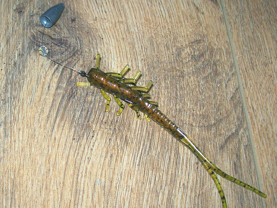 Der Haken wird mit einem Hellgie, der Imitation einer Insektenlarve, bestückt. Ich werfe den Köder aus und lasse ihn absinken. Es ist ganz wichtig, dass der Köder kontrolliert, also an gestraffter Schnur zum Grund taumelt. Manchmal kommt nämlich schon beim Absinken der erste Biss. Hängt die Schnur durch, bekommt man gar nicht mit, dass ein Räuber den Köder genommen hat. Die Gummilibelle lässt man mit leichten Zupfern der Rutenspitze über den Grund hüpfen.