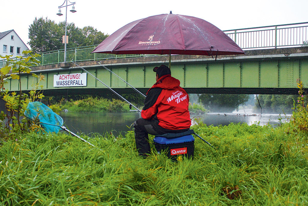 Der Regen der vergangenen Tage hat den Fluss leicht ansteigen lassen. Das passt den Aalen ganz gut. Hindernisse lassen sich somit leichter überwinden und durch die stärkere Strömung können sie sich einfach flussab treiben lassen. Derzeit regnet es leicht. Ich sitze oberhalb eines kleinen Wehres. Hier fließt das Wasser langsamer, und in der Flussmitte befindet sich eine tiefere Rinne, in der die abwandernden Aale entlang ziehen. Zudem sammeln sich die Fische vor dem Wehr kurz, bevor sie den Weg in die Fischtreppe finden. Also ideal für das Vorhaben „Großaal“!