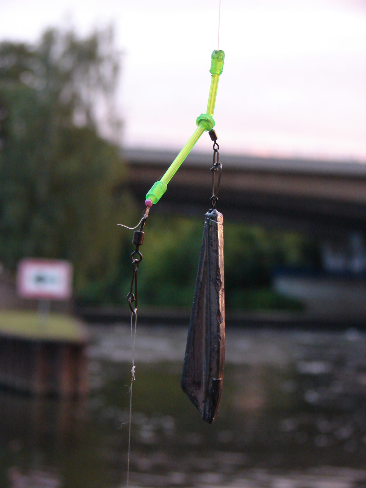 An Flüssen bietet es sich an, mit einer Freilaufmontage auf die schlangenförmigen Räuber zu angeln. Dafür wird auf die Hauptschnur ein Anti-Tangle-Boom gezogen, in den das Blei eingehängt wird – gefolgt von einer Perle, die eine Beschädigung des Knotens mit dem Karabinerwirbel verhindert. Der Karabinerwirbel dient dazu, um ein schnelles Auswechseln des Vorfaches zu gewährleisten, falls es doch einmal zum Abriss des Hakens kommen sollte. So haben Sie Ihre Montage wieder schnell im Wasser.