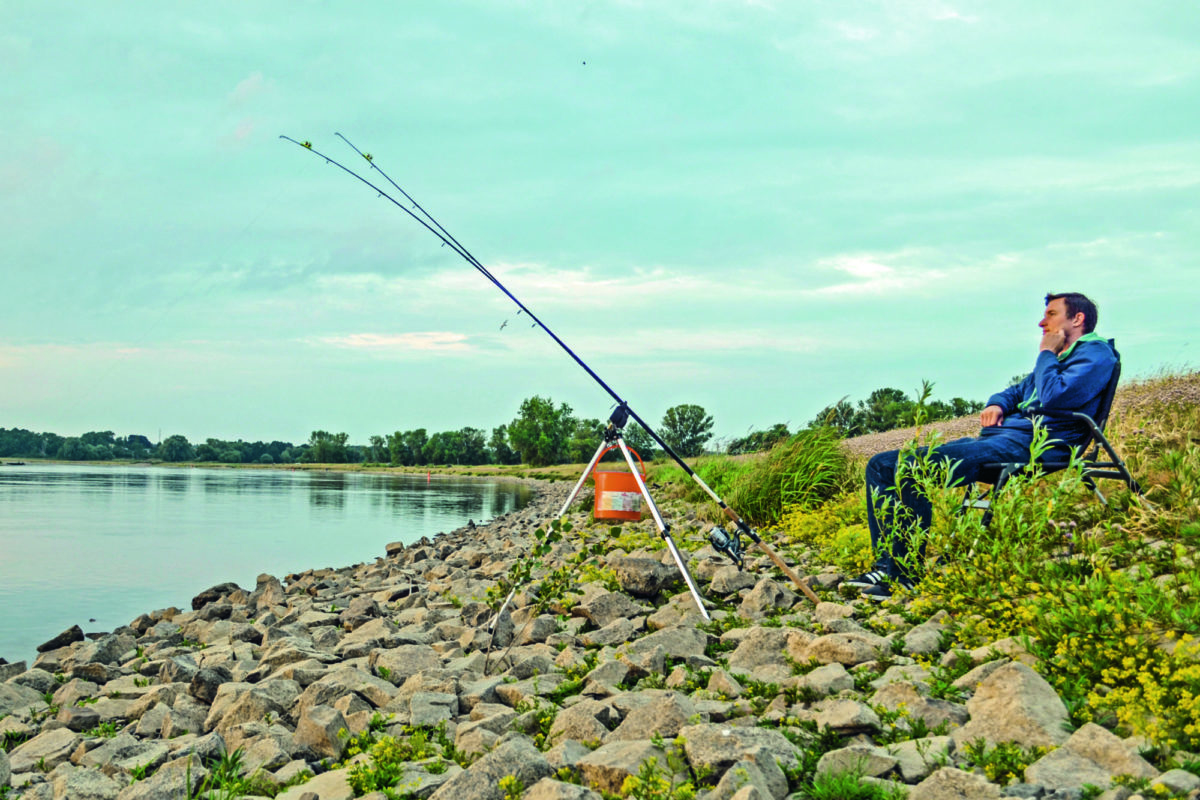 Um in der starken Strömung großer Flüsse zu angeln ist einfaches, aber stabiles Gerät erforderlich. Kräftige Spinn-, Heavy-Feeder- oder starke Karpfenruten sind ideal, um Bleie von 80 bis 250 g Gewicht in Richtung Flussmitte zu katapultieren (wir sprechen hier von den großen Strömen wie Rhein, Elbe oder Weser!). Kombiniert wird die Rute mit einer robusten Rolle, gefüllt mit 16er Geflochtener, der eine doppelt Ruten-lange 0,35er Schlagschnur aus monofiler Schnur vorgeschaltet ist. Optimal ist eine Rolle mit Freilauf, denn Aal-Bisse im Strom sind meistens extrem kräftig. Wundern Sie sich nicht, wenn ein nur 60 cm langer Aal die Rute fast ins Wasser zieht. Mit eingeschaltetem Freilauf kann so etwas nicht passieren.