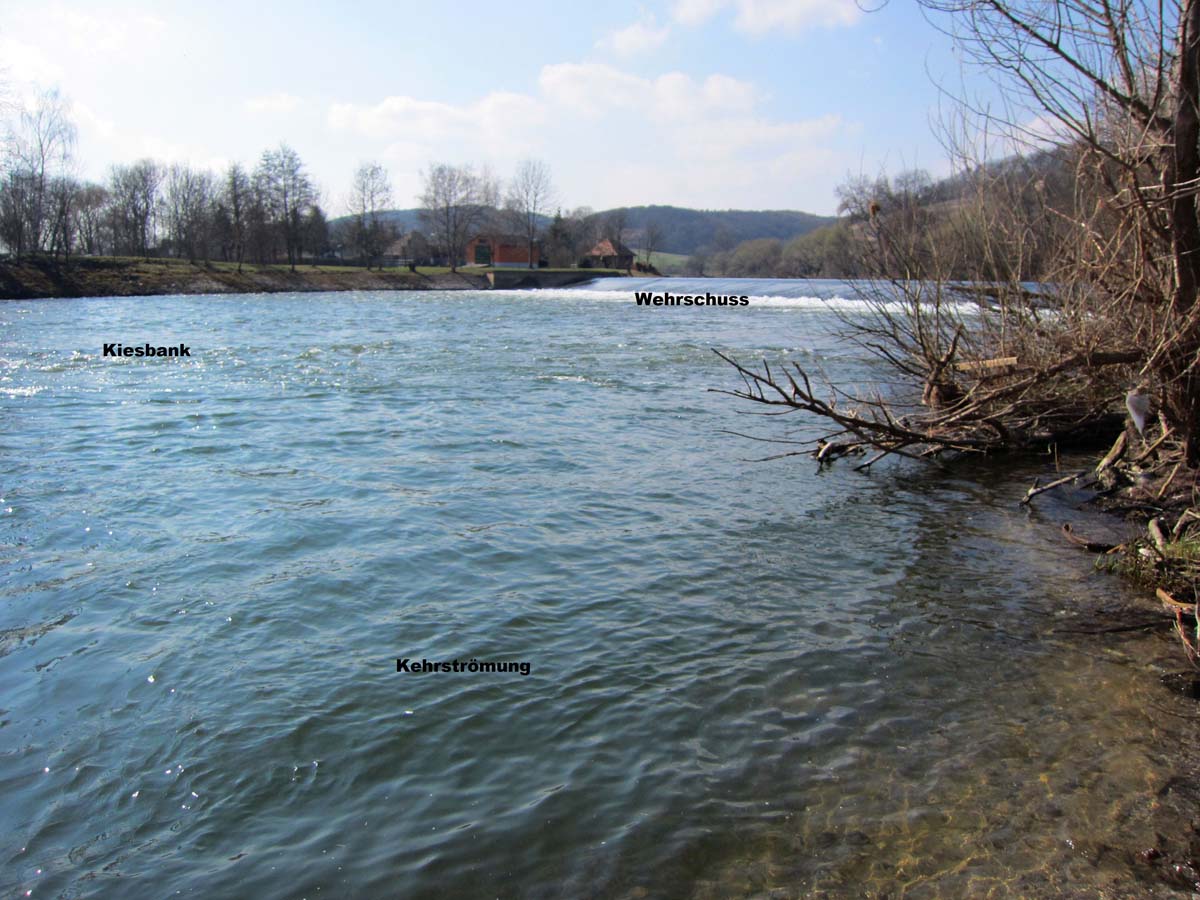 Der Wehrschuss ist deshalb so interessant, weil sich der Wehrbalken unter Wasser noch ein Stück fortsetzt und so ein Strömungsschatten entsteht. Oft liegen in diesem Bereich auch noch größere Steine, welche zusätzliche Deckung bieten. Da ein Gummifisch sich in im Wehrschuss oft nicht kontrolliert führen lässt, kommen Wobbler zum Einsatz. Am liebsten fette Crankbaits, die grundnah laufen und gerne auch auffällige Farben, wie beispielsweise Firetiger oder Redhead haben dürfen. Rasselkugeln im Innern können ebenfalls sinnvoll sein.