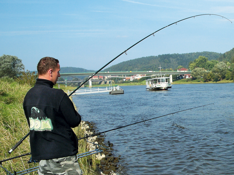 Bei leichtem Wind stelle ich die Ruten immer sehr steil auf, dadurch habe ich eine bessere Bisserkennung und kann mehr Schnur aus dem Wasser halten. Damit wird das Gerät entlastet und man sammelt weniger Treibgut auf. Nur bei starken Windböen ist es ratsam die Ruten sehr flach zu stellen um den Luftwiderstand zu verringern. Damit man in der Nacht keinen Biss verpasst, wird jede Rutenspitze mit einem Knicklichthalter ausgerüstet. Sobald das Knicklicht deutlich ausschlägt, kann ein beherzter Anhieb erfolgen. Wer schon einmal an einer Steinpackung gefischt hat, wird ein Lied davon singen können, dass dieser Bereich das reinste Ködergrab ist. Vor allem, wenn man mit normalen Aalmontagen angelt. Selbst wenn wir die Köder am Übergang von der Steinpackung zum Flussgrund platzieren, lassen sich Hänger nie völlig vermeiden.