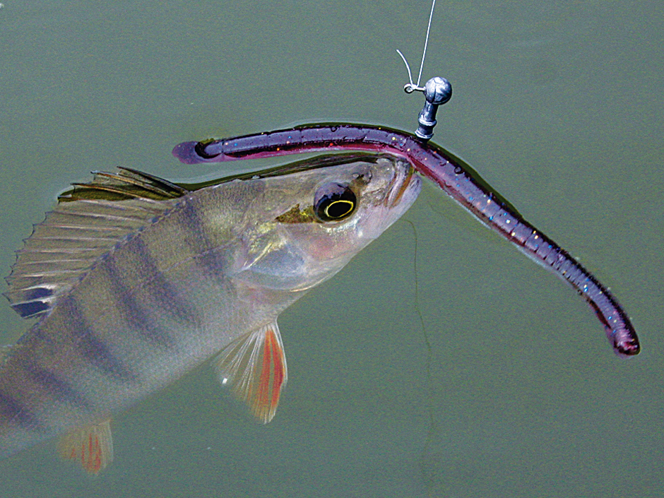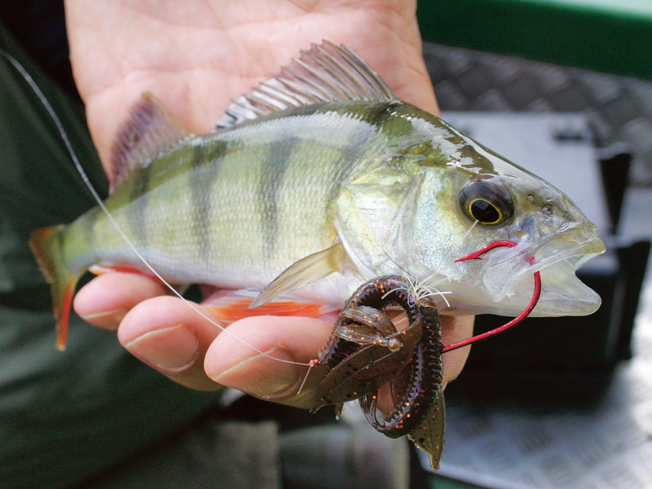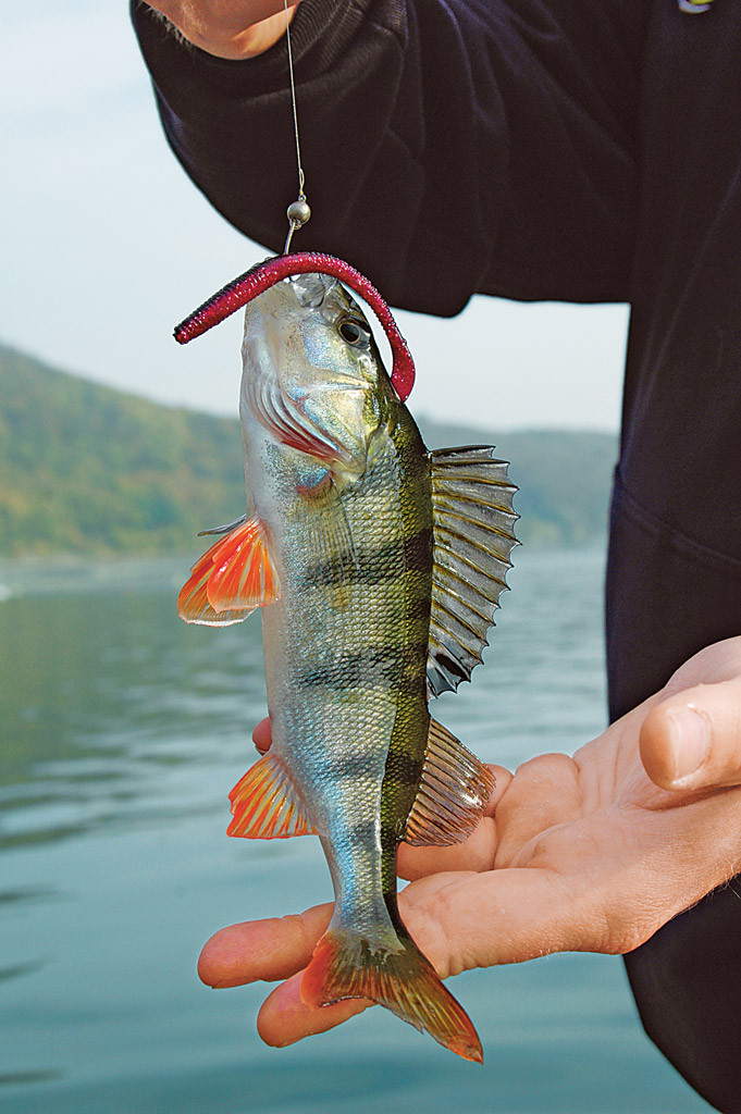 Wir holen knapp zwei Dutzend Barsche aus dem Gehölz, dann scheinen sie auch die Gummi-Methoden durchschaut zu haben. Aber es gibt ja noch andere Möglichkeiten. Ich wechsle also auf die Wacky-Technik, mit der ich einen Gummiwurm zwischen dem Geäst anbieten will. Der Wurm wird mittig auf den Haken gespießt. So lasse ich ihn durch ständiges Vibrieren mit der Rutenspitze im Mittelwasser herumwackeln. Das gefällt den Barschen, und schon hängt der erste. Es fallen gleich noch ein paar Artgenossen auf diese Methode herein, dann ist aber auch Schluss mit der Wacky-Technik.