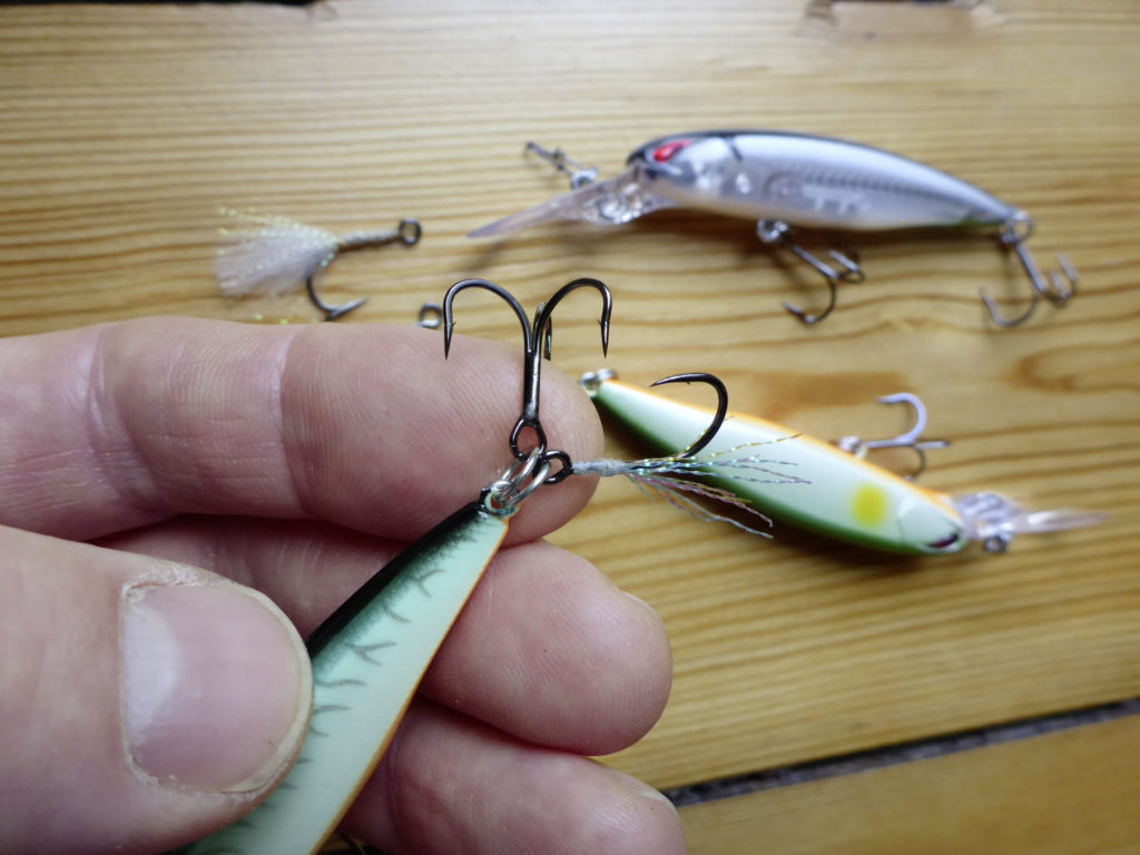 Jetzt macht es viel mehr Sinn, einen kleinen Wobbler ins Rennen zu schicken, als stur den Grund abzukratzen. „Wobbler“ meint in diesem Fall „Suspender“, also einen Wobbler, der im Stillstand im Wasser schwebt. Davon gibt’s inzwischen eine ganze Menge. Meine Favoriten zum Barsche twitchen sind der Laydown Minnow, der absolut waagerecht im Wasser steht und der sehr weit fliegende Pavlo Shad. Beide tauchen so um 2 Meter tief, was für meine Kanäle vor der Berliner Haustür ideal ist. Wenn’s tiefer gehen muss, schaut Ihr Euch mal nach Tiefläufern um, die sich durch eine noch längere Tauchschaufel auszeichnen. Das Prädikat „Suspender“ sollte aber unbedingt auf der Verpackung stehen.