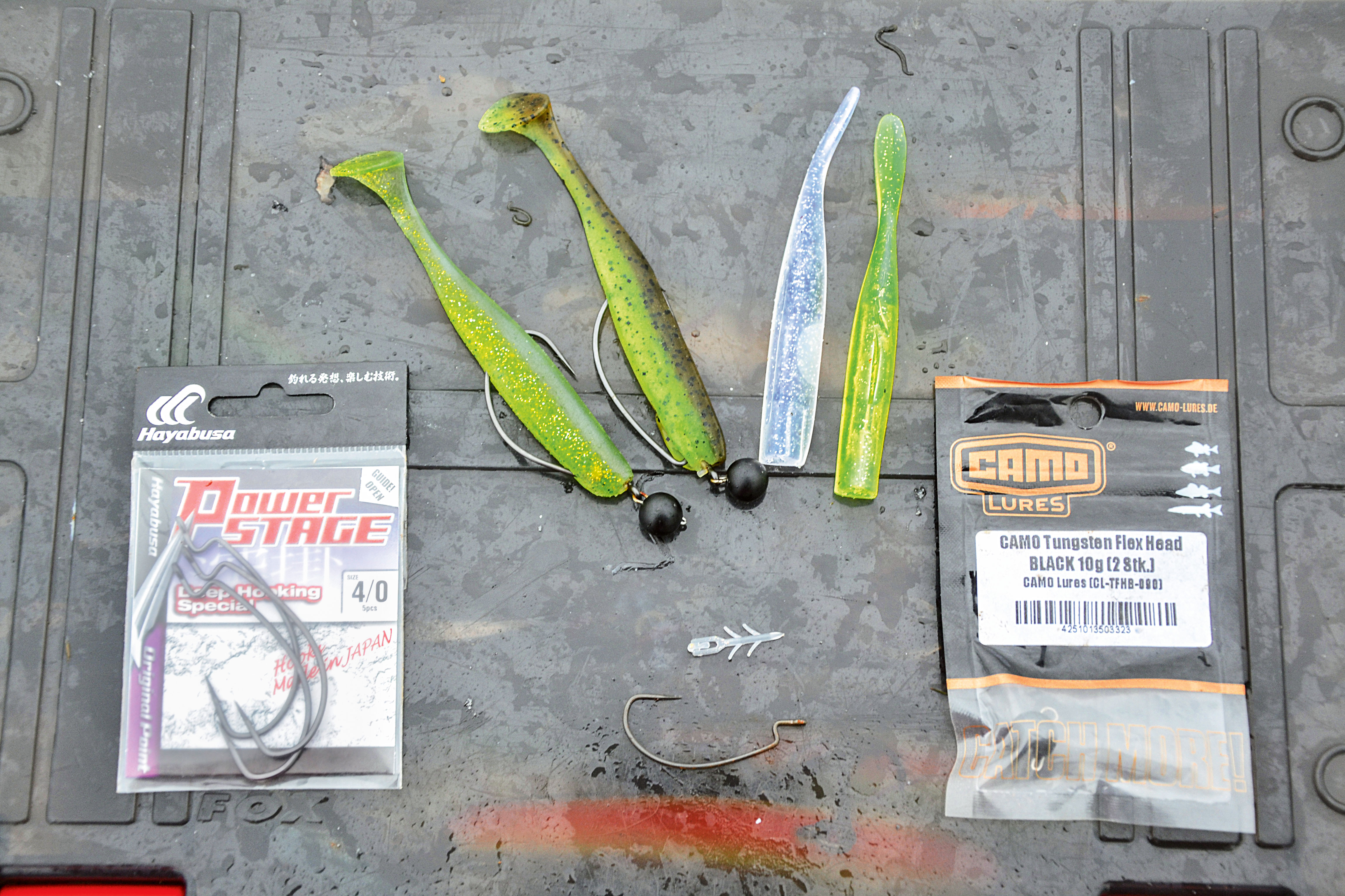 - Das braucht Ihr für eine Cheburashka-Jig Montage: Flex Heads, Softbaits, Wide Gap-Haken und Final Keeper.