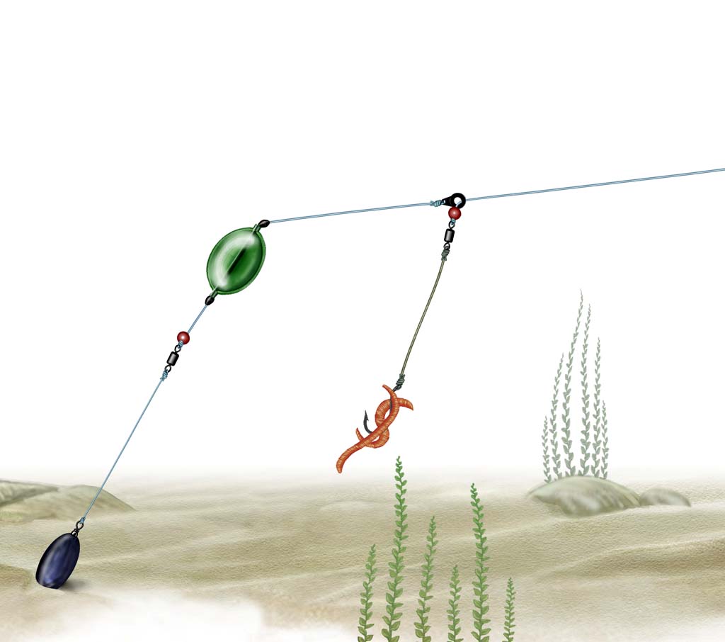 Das Dyson-Rig wird über Kraut eingesetzt. Die Unterwasserpose ist zwischen zwei Stoppern montiert und kann daher verschoben werden. Auf diese Weise lässt sich regulieren, wie weit der Köder über dem Kraut schweben soll. Wichtig ist auch, dass das Endblei an einem nur 0,20 bis 0,25 Millimeter dünnen Stück Monofil mit dem Endwirbel und der restlichen Montage verbunden wird! Dieses Monofil dient als Sollbruchstelle, wenn sich das Blei unlösbar im Kraut festgesetzt hat. So verliert man nur das Blei, aber nicht den Fisch!