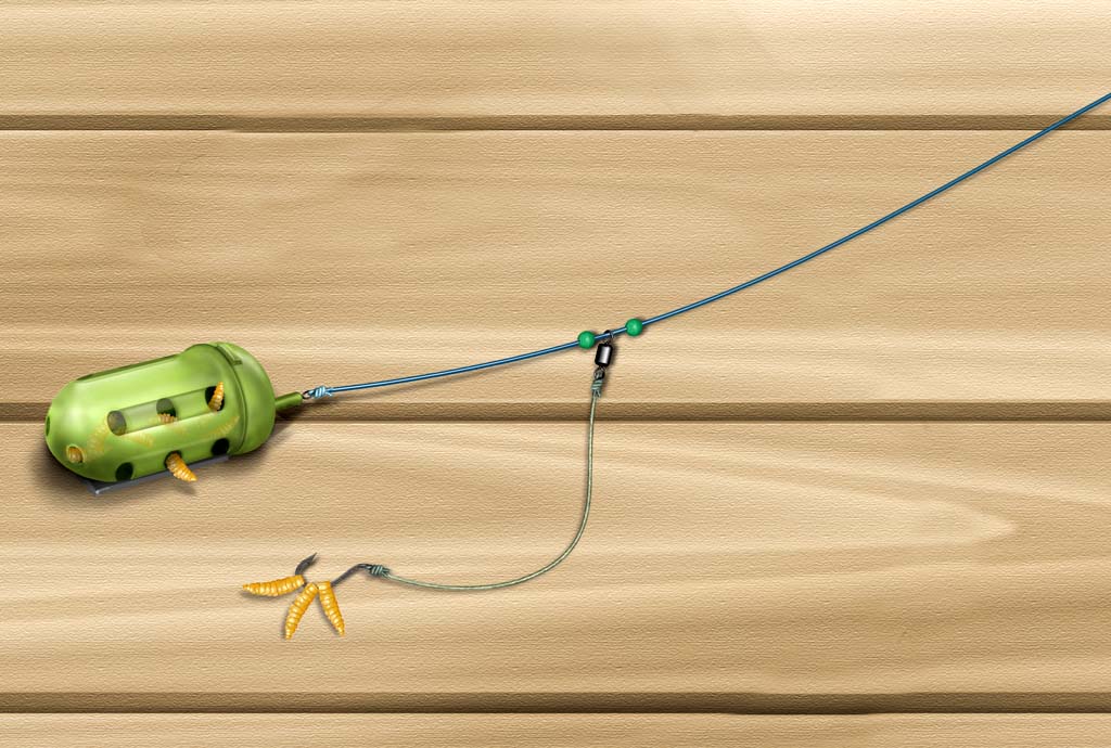 Das Helikopter-Rig stammt eigentlich aus der Friedfischangelei. Es wird im Vorfrühling mit Maden oder Wurmstücken gefischt. Der Futterkorb wird ebenfalls mit Maden (oder ersatzweise mit Wurmstücken) befüllt. Die Stopper, die den Seitenzweig auf Position halten, sollten aus Gummi sein, damit das Vorfach im Drill nach unten bis an den Futterkorb rutschen kann und Tüddel zwischen dem schlagenden Aal und dem Futterkorb ausgeschlossen ist.