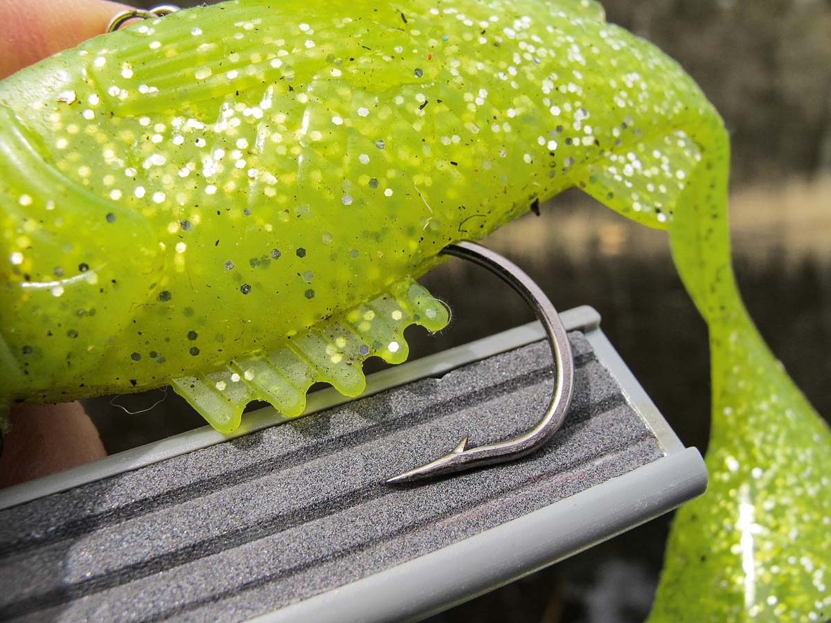 Die Haken von Kunstködern werden stark belastet – dauernd schrammen sie über Steine, schleifen an Muscheln entlang und bohren sich in Holz. Aber kaum ein Angler kommt auf die Idee, sie auszutauschen. Deshalb angeln wir oft mit ziemlich unscharfen Jighaken oder Drillingen.