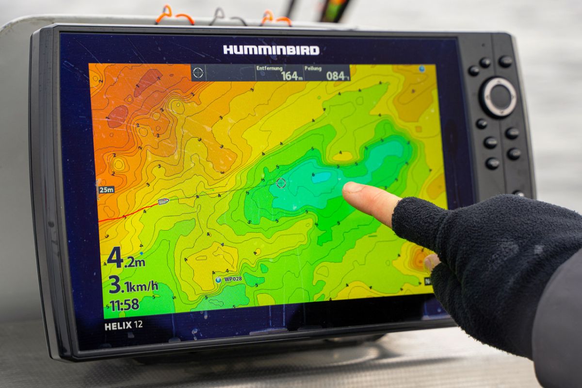 Hier hellblau markiert ist eins der tiefen Fluss-Löcher, die Jan befischt. Er stellt sich mit dem Boot immer an die Kante und fischt ins Tiefe.