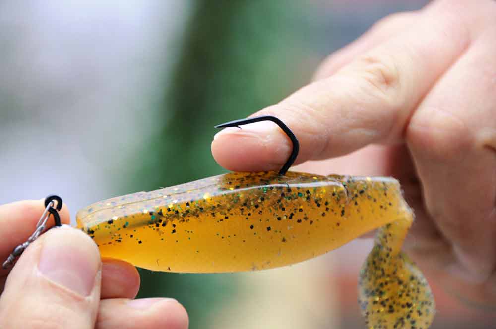 - Gummifisch-Typ: Ein Gummifisch mit Schaufelschwanz hat mehr Wasserwiderstand als ein Köder mit V-Schwanz, somit wird mehr Gewicht benötigt.