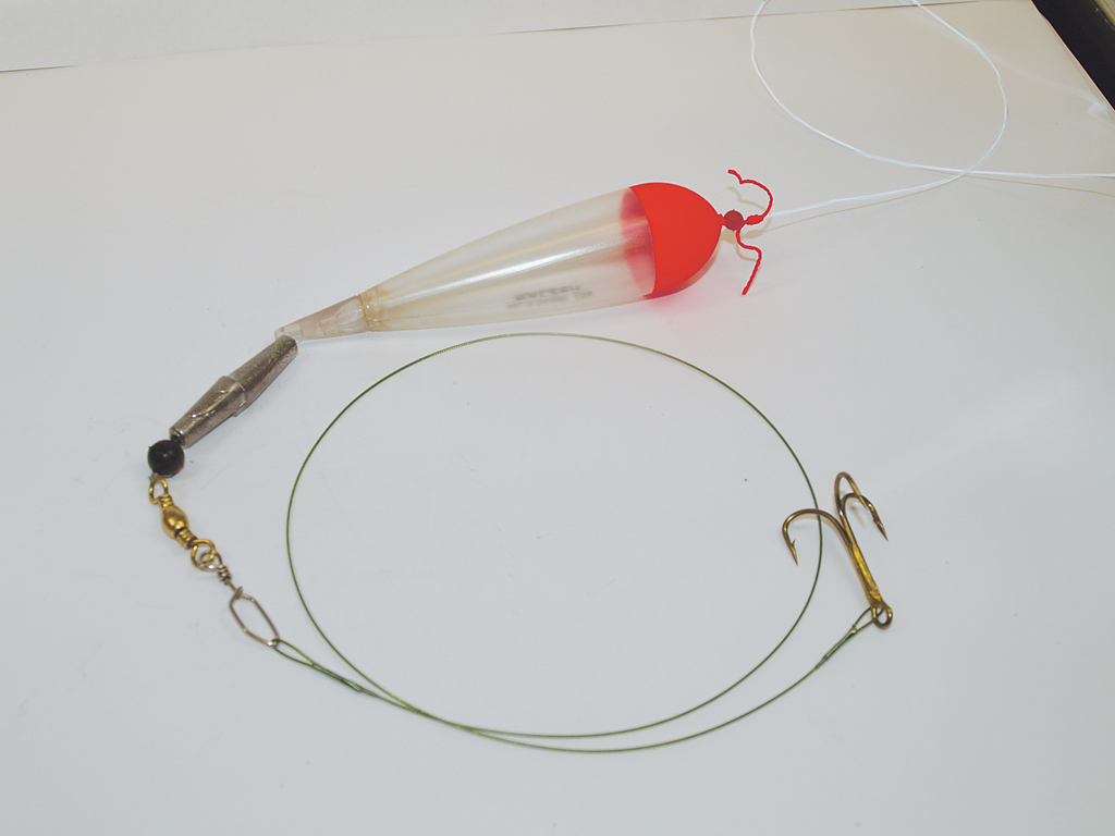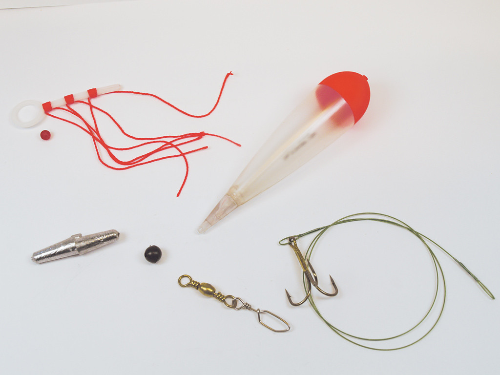 – 50 Zentimeter langes Stahlvorfach mit Drilling der Größe 6 oder 8 - Um die Tiefe einzustellen, wird der Stopper an der gewünschten Stelle auf der Hauptschnur platziert. Dann zieht man die kleine Perle und die Pose auf.