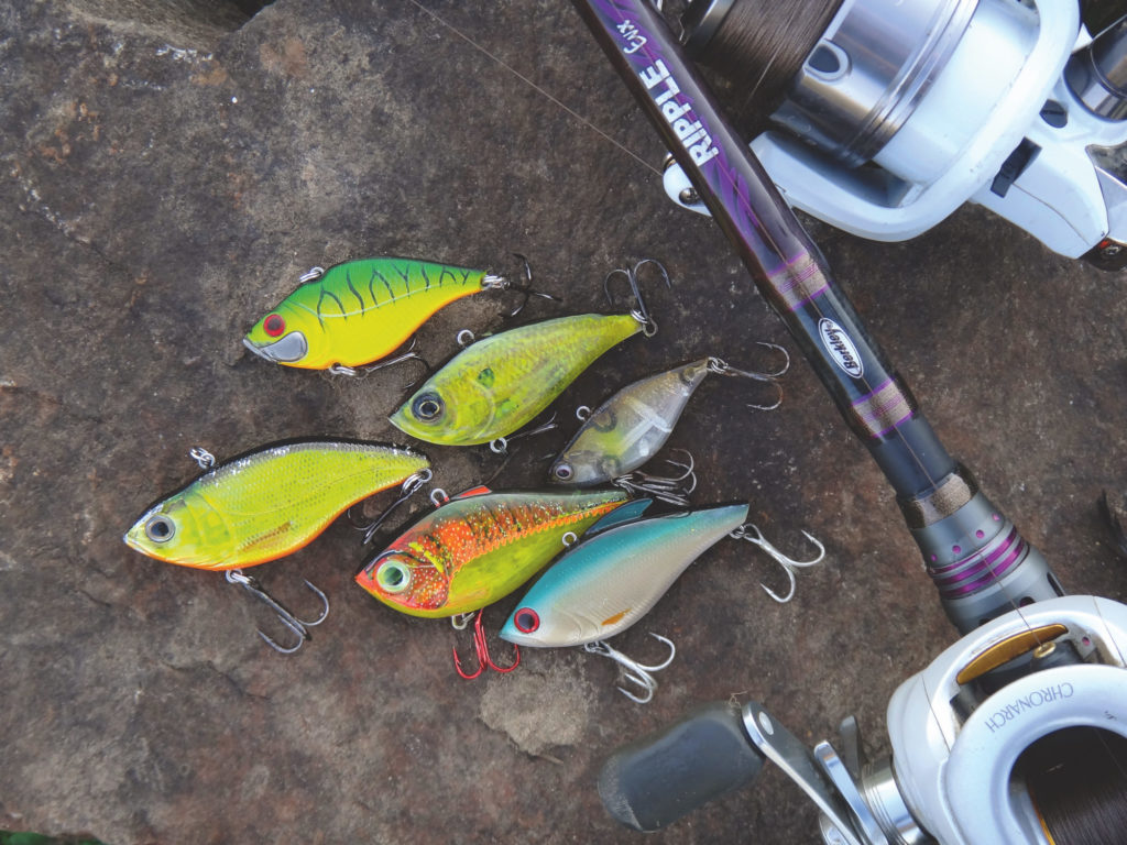 Lipless Crankbait sind Wobbler ohne Tauchschaufel. Der Körper dieser Köder ist flach, die Einhängeöse befindet sich auf dem Rücken. Kurbelt man sie ein, fungiert der Rückenbereich vor der Öse als Tauchschaufel, der die Tauchtiefe festlegt. In den allermeisten Fällen handelt es sich aber um sinkende Modelle, die man in der ganzen Wassersäule anbieten kann. Man unterscheidet zwei Varianten: Rattler und Vibration-Lures. Bei den Rattlern (das sind die allermeisten Lipless Crankbaits) befinden sich im Körper Rasselkugeln, die beim Einkurbeln klappern. Dabei entsteht viel „Lärm“, den die Fische schon von Weitem wahrnehmen. Im Gegensatz dazu sind die Vibrationlures lautlos. Die Flatt Shads von Sébile sind z.B. mit Öl gefüllt und reizen die Fische allein durch die starken Vibrationen, die dadurch entstehen, dass der flache Körper beim Kurbeln durchs Wasser flattert. Hierbei entstehen Druckwellen, welche die Fische ebenfalls aus Entfernung über ihr Seitenlinienorgan orten können.