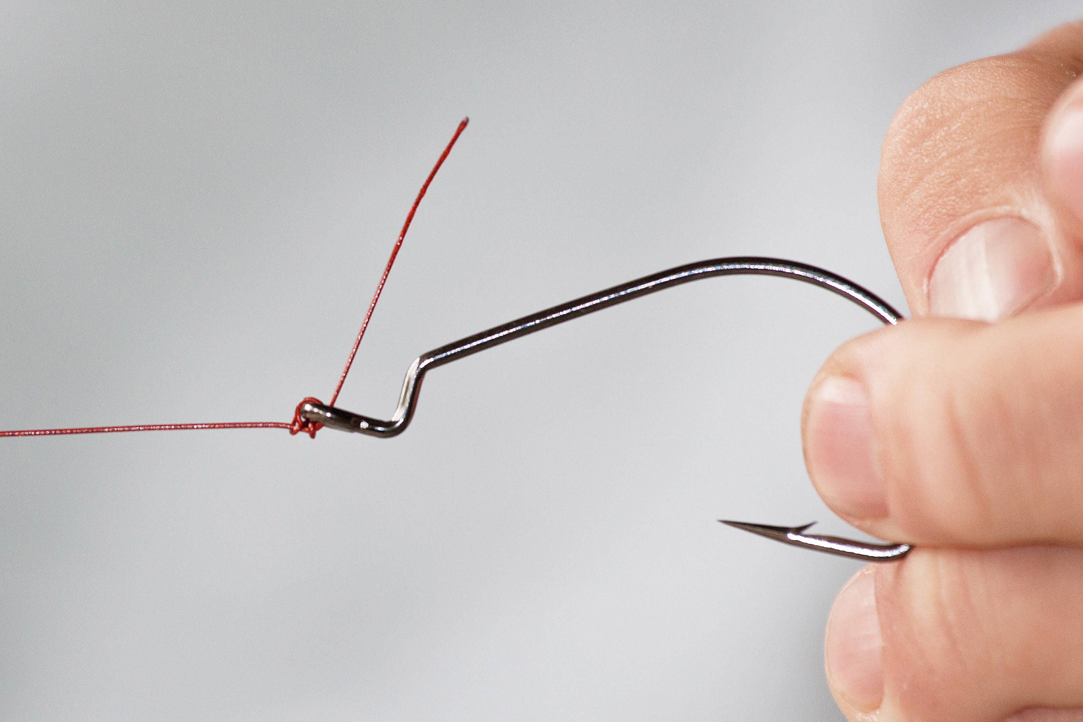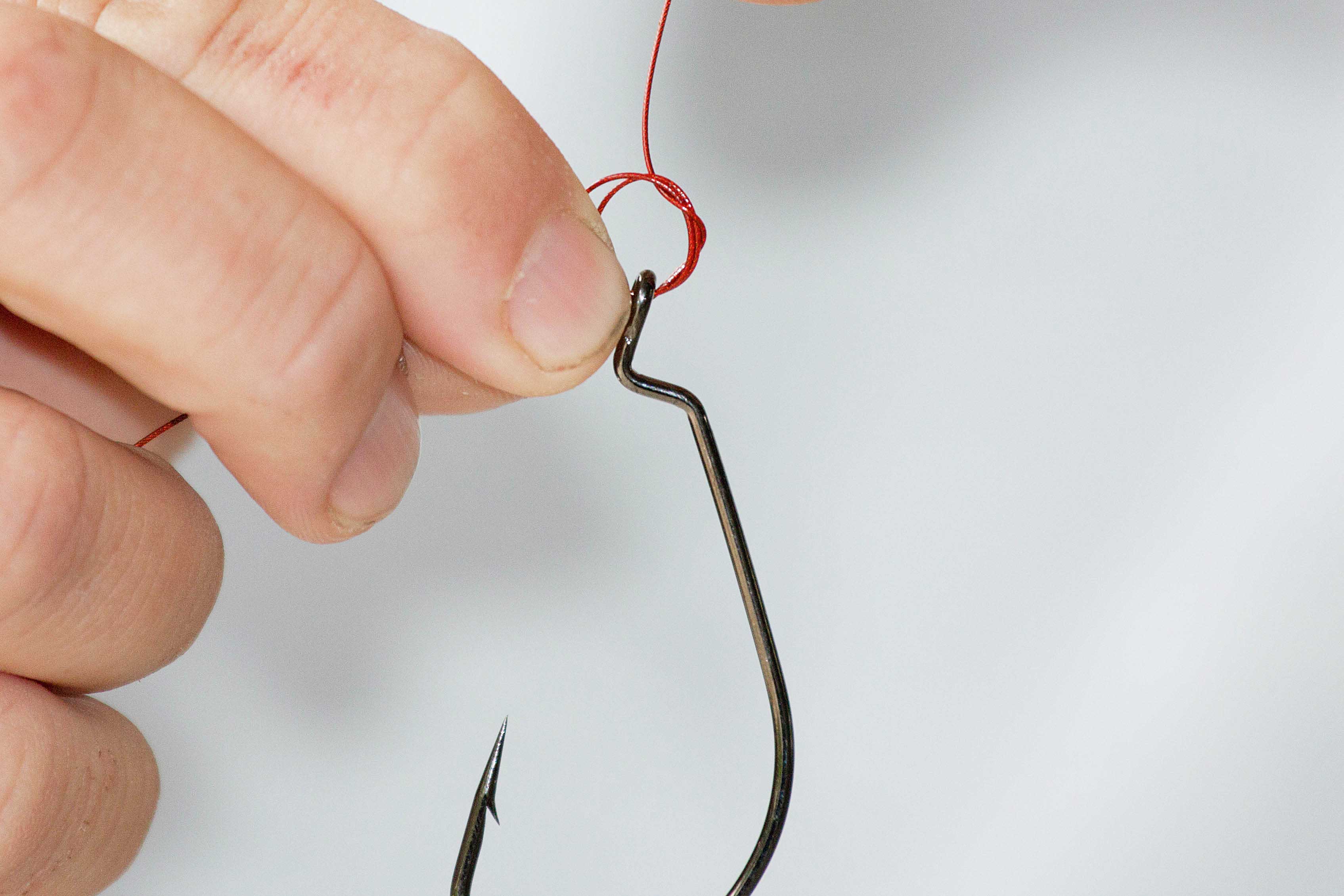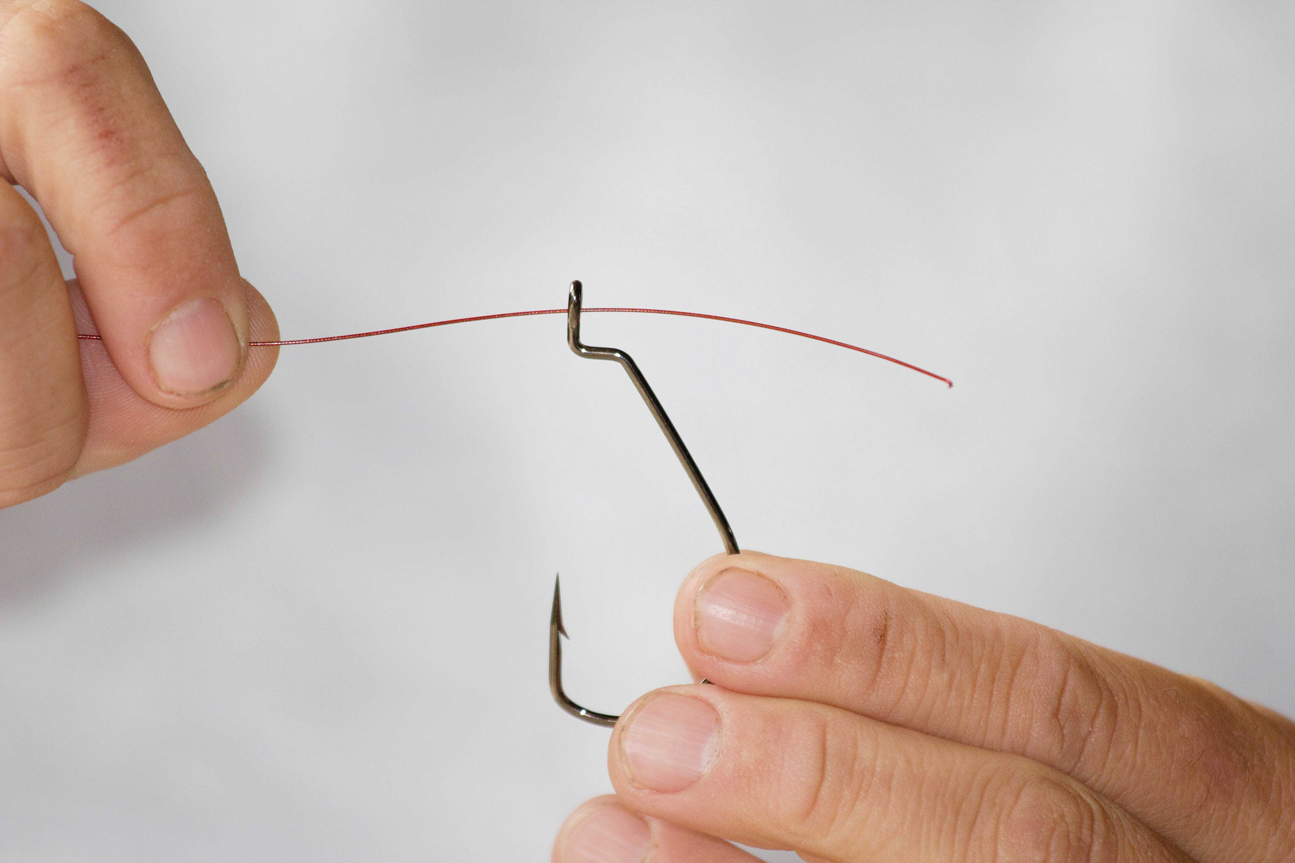 - Der Fat- Mono-Knoteneignet sich bestens zum Anknoten des Hakens. Zuerst zwei Schlaufen durch das Öhr führen…