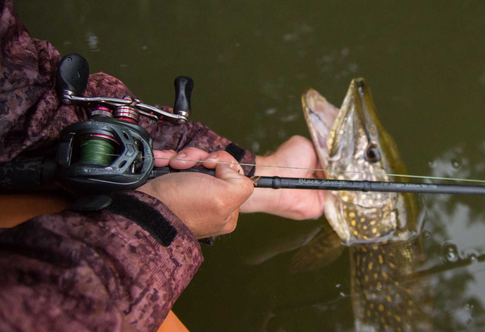 Dazu passt eine kräftige Rute, um große Fische an kurzer Leine und in starkem Kraut ausdrillen zu können. Ich rate aber von Ruten mit einer „Besenstiel-Aktion“ ab, da die Fische schnell ausschlitzen. Ich bevorzuge Modelle mit einem Wurfgewicht von 70 Gramm bei 2,20 Meter Länge.