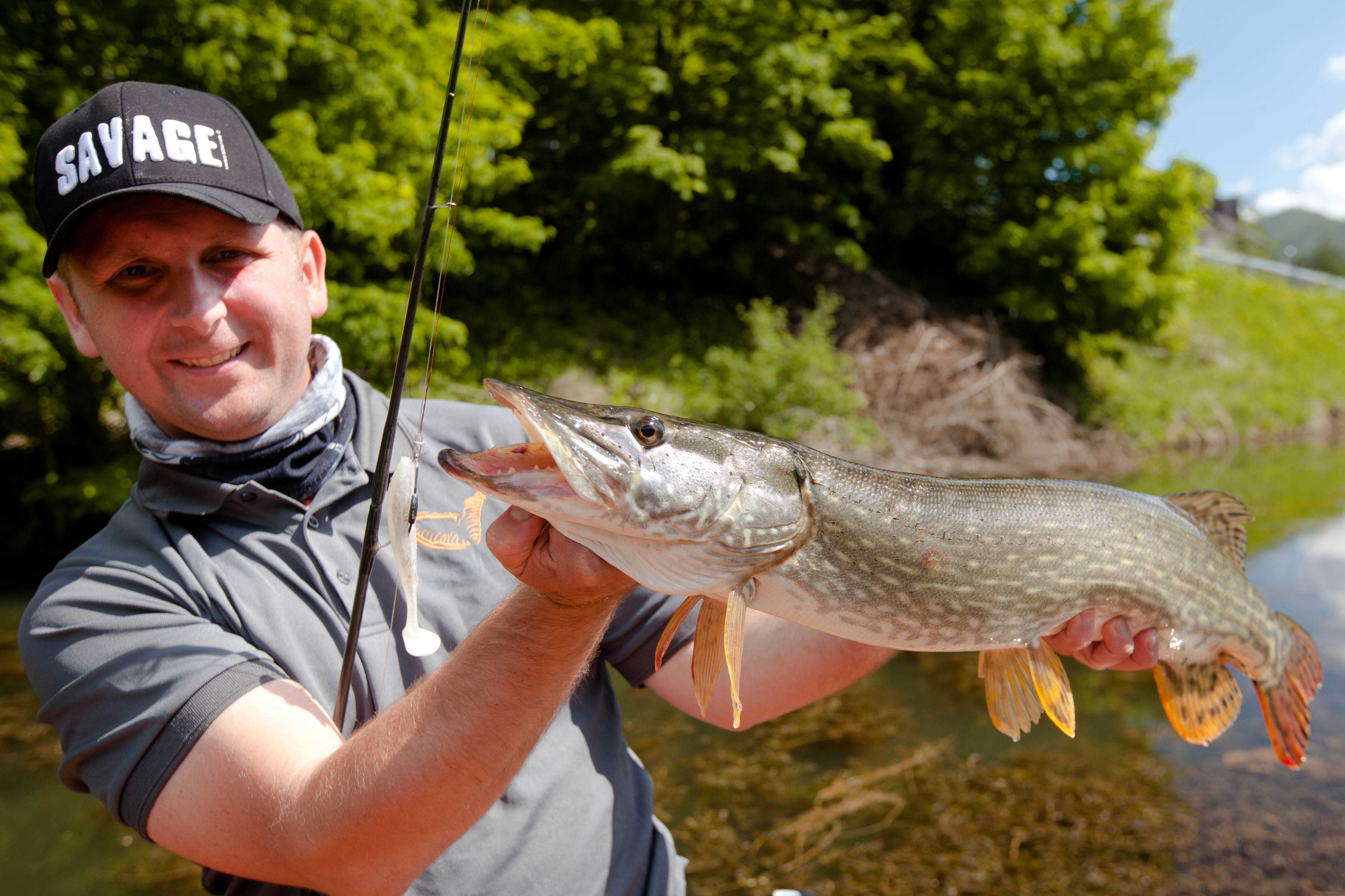 Die Bisse spürt man durch einen heftigen Schlag in der Rutenspitze. Vielleicht sieht man auch eine Bugwelle im Wasser oder eine Bewegung im Kraut. Ich setze den Anhieb immer mit etwas Verzögerung. Manchmal ziehe ich den Köder auch zunächst ein wenig, um sicher zu sein, dass der Fisch ihn vollständig im Maul hat – die Räuber lassen ihn nicht so schnell wieder los.