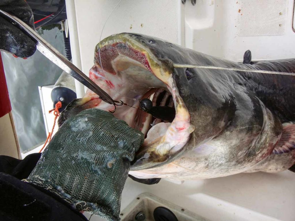 Das Gleiche gilt, wenn der Haken ganz vorne am Unter- oder Oberkiefer oder im Maulwinkel sitzt. Da Welse aber ein sehr breites Maul haben, ist es eigentlich fast immer möglich, dem Fisch irgendwie ins Maul zu fassen und den Unterkiefer per Wallergriff zu fixieren. Der Griff muss nur beherzt und kräftig sein. Dann ist das Risiko nahezu ausgeschlossen, dass man sich einen der Haken selbst in die Hand rammt!