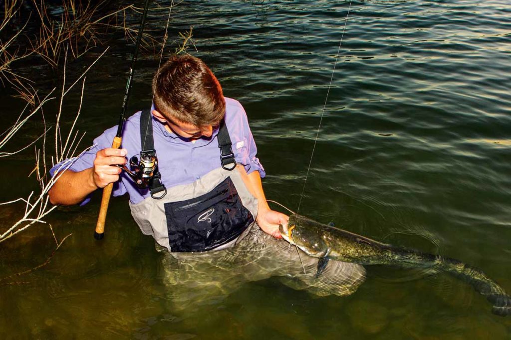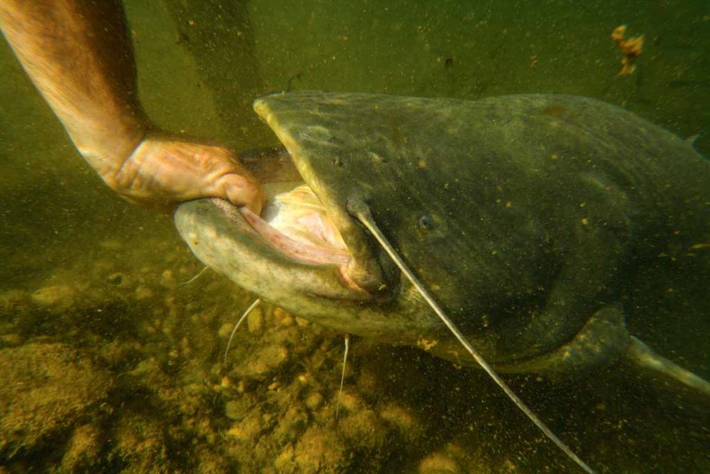 „Nackter“ Wallergriff: Es ist nicht empfehlenswert, einem großen Wels ohne Handschuhe ins Maul zu greifen.