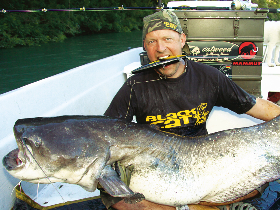Die schwere Spinnrute ist krumm bis ins Handteil, und Schnur wird von der Rolle gerissen. Es dauert etwa 25 Minuten, bis ich den Fisch das erste Mal in Sichtweite habe. Es ist ein ganz Dicker. Und das beim Spinnfischen. Als der Gigant zum zweiten Mal auftaucht, greife ich ihm ins Maul und ziehe ihn ins Boot. Sauber hängt der große Wobbler im Maul des riesigen Räubers. Das Maßband zeigt eine Länge von 2,35 Meter an. Dieses Erlebnis hat mir gezeigt, dass beim Welsangeln folgende Anglerweisheit zutrifft: Mit großen Ködern fängt man große Fische. Ist eigentlich auch logisch, denn warum sollte ein Wels bei der Jagd nach mehreren kleinen Beutefischen, wenn er auch einen großen Happen haben kann?