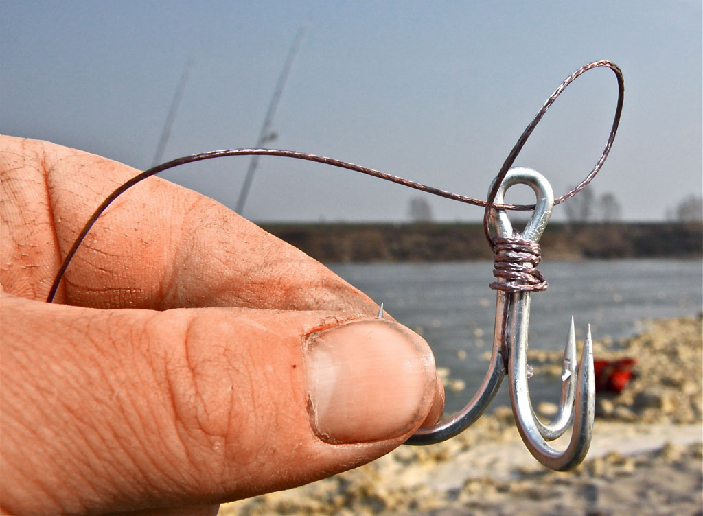 - Mit dem Vorfach werden 6 bis 8 Wicklungen am Drilling von oben nach unten durchgeführt und mit dem Ende wieder durch die Öse des Hakens gefädelt. So entsteht eine knotenlose Welsmontage, welche vielen bereits bekannt sein müsste.