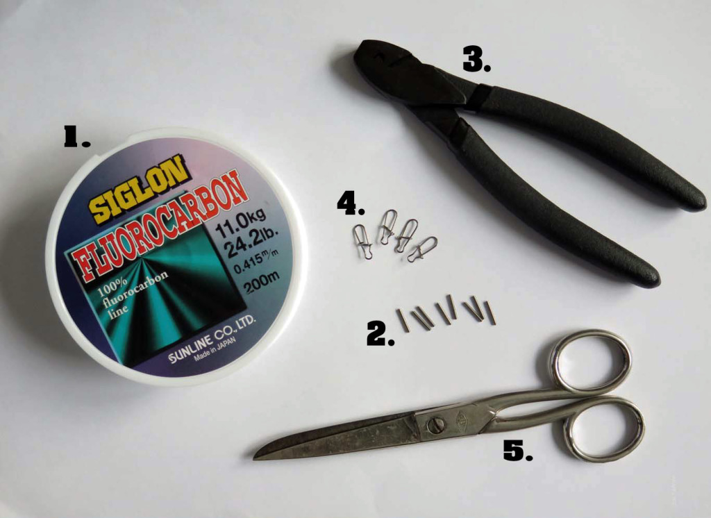 Diese Materialien benötigst Du für Dein Zander-Vorfach: Fluorocarbon (1), Klemmhülsen (2), Klemmhülsenzange (3), Snaps (4) und eine Schere (5). Der Preis für diese Utensilien beläuft sich auf circa 22 Euro. Jedoch ist diese abhängig von der Stärke und Länge des FC sowie der Herstellermarke der Snaps, Klemmhülsen und  Zange. Doch diese Investition zahlt sich auf lange Sicht deutlich aus, im Vergleich zu gekauften Fertigvorfächern. Je nach Übung beträgt die Montage des Zander-Vorfaches circa 2 Minuten.