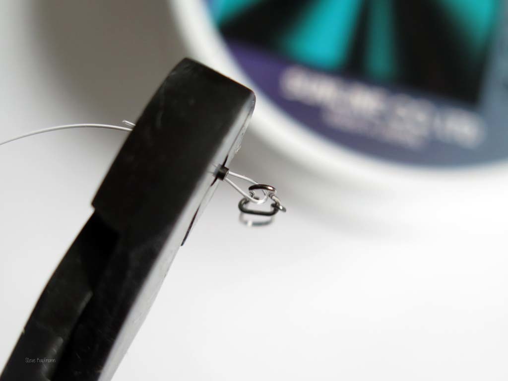 Das Schnurende, welches aus der Hülse noch herausragt, am besten mit einer Schere abschneiden. Wenn das nicht gemacht wird, kann sich das Zander-Vorfach im Drill schnell die Schnur darin verfangen oder sich Kraut darin festsetzen.