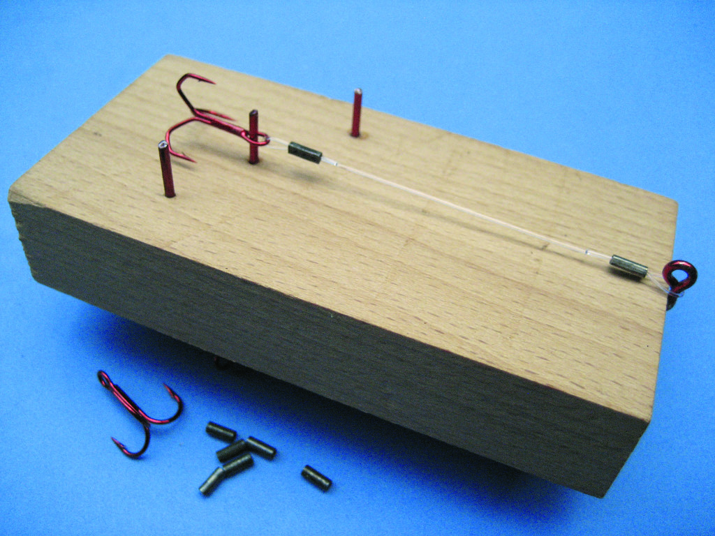 Um Stinger-Vorfächer immer auf die gewünschte Länge zu bringen, kann man sich eine Schablone für verschiedene Köderlängen anfertigen.Für eine Stinger-Schablone benötigt man nicht mehr als ein Holzbrettchen und ausgediente Jighaken.(von Horst Menten)