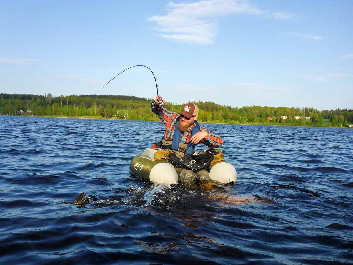Karussellfahrt: Selbst mittlere Hechte sind in den Schären extrem kampfstark und spielen Kreisel mit Bellyboot und Angler – den freut es!