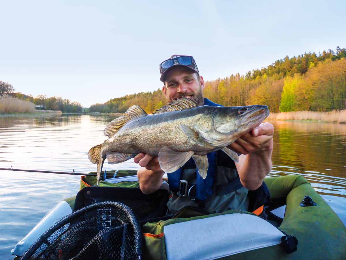 Das flache Wasser und hoch stehende Kraut laden an diesen Stellen zum Oberflächenangeln ein. Diese Methode kann ich auch wärmstens empfehlen – wir erlebten aggressive Fische und spektakuläre Bisse! Der Fußmarsch in die Schweinebucht hat sich für uns auf jeden Fall gelohnt. Neben einigen guten Barschen fangen wir unzählige Hechte. „Morgen gehen wir Zander fangen!“ kündigt Johannes an, als wir im Dunkeln durch das Schilf zurück zum Auto stapfen – sofort erwacht Vorfreude auf das nächste Highlight.