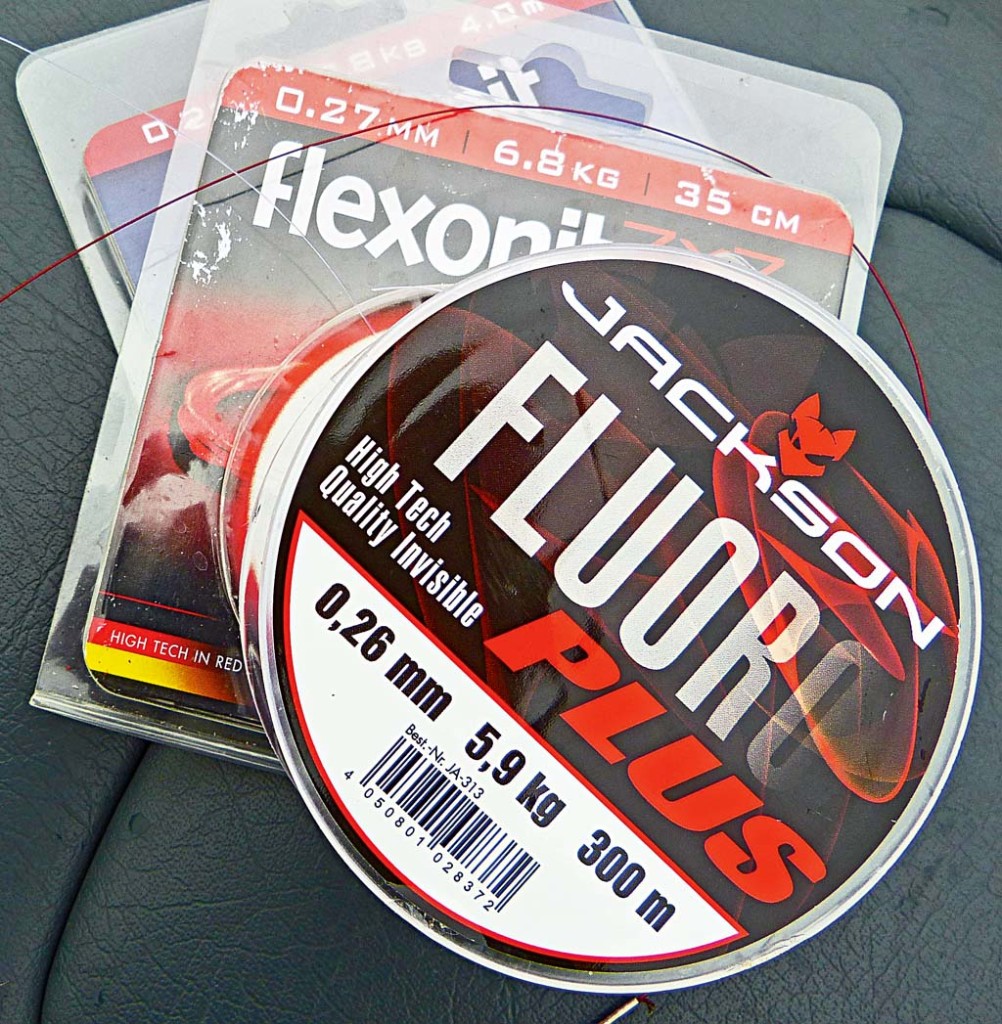 Wenn ich nicht mit Hechten rechnen muss, bevorzuge ich als Vorfachmaterial Fluorocarbon in den Stärken 0,24 bis 0,30 Millimeter. Es soll die Verbindung zwischen der geflochtenen Hauptschnur und dem Köder unsichtbar für Zander und Barsch machen. Natürlich ist es auf Muschelgrund auch wesentlich abriebfester als das Geflecht.