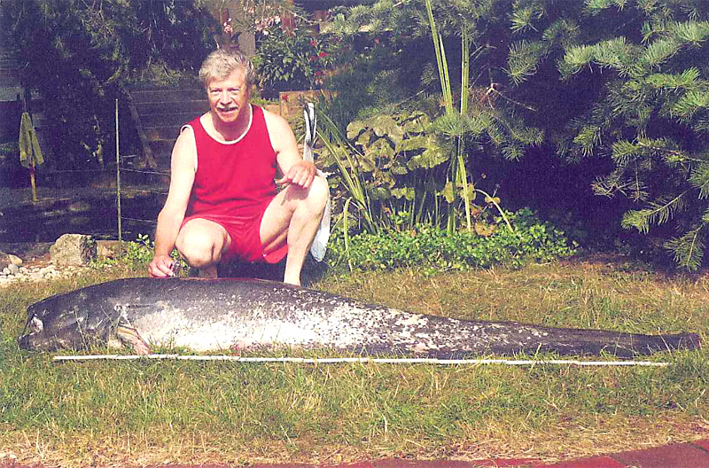 Einfach eine Schlepptour wollte Klaus Ade am 2. Juli auf dem Knielinger See machen. Das etwa 100 Hektar große Gewässer liegt in einer malerischen Rheinauenlandschaft und hatte ihm schon in der Vergangenheit schöne Hechte, Zander und Welse beschert. Dieses Jahr hatte er schon zwei Welse von 1,60 und 1,02 Meter dort landen können. Geangelt wurde vom Boot mit einer Shimano-Teleskoprute (bis 130 Gramm Wurfgewicht) und einer geflochtenen Schnur von rund 26 Kilogramm Tragkraft. Vor das 30 Zentimeter lange Stahlvorfach war ein etwa 17 Zentimeter langer Spinner geschaltet. Dieser Radaubruder fand schon bald Gefallen bei einem Kapitalen. Nach dem Biss war sofort klar, dass ein Ausnahmefisch gehakt war, doch Klaus Ade ließ sich nicht aus der Ruhe bringen, obwohl im ersten Moment nicht klar war, wer wen im Schlepptau hatte. Und so drillte der Angler seinen Gegner mehr als zwei Stunden. Da kein anderer Kollege am Wasser war, der das Spektakel sehen und den er zur Hilfe rufen konnte, bemühte sich Klaus Ade, das Boot irgendwo zu stranden, um den Fisch vom Land aus müde zu drillen. Doch der Wels am Haken vereitelte seine Versuche und nahm immer wieder Schnur. Erst beim achten Landeversuch erreichte Ade dann das rettende Ufer. Dort konnte er seinen mittlerweile stark ermüdeten Gegner an den Brustflossen packen und per Wallergriff an Land wuchten. Das spätere Wiegen des Riesenwelses ergab ein Gewicht von 155 Pfund bei 2,27 Meter Länge.