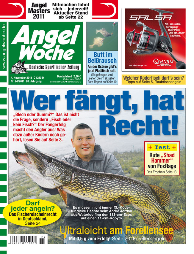 „Blech oder Gummi?“ Das ist nicht die Frage, sondern „Fisch oder kein Fisch?“ Der Fangerfolg macht den Angler aus! Was dazu außer Ködern noch gehört, lesen Sie in der aktuellen AngelWoche!