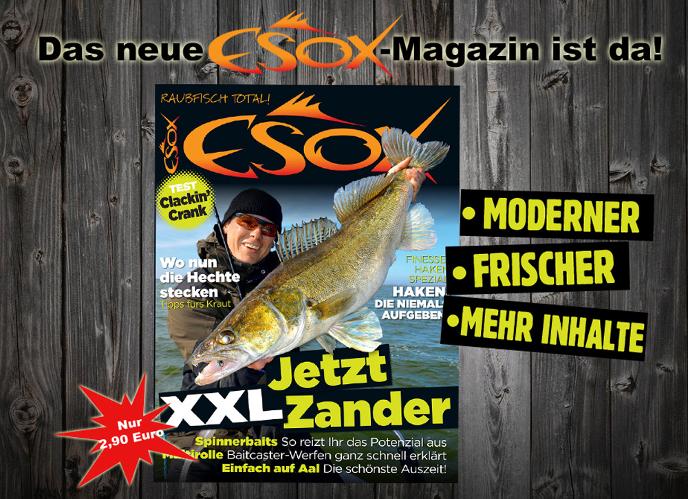 Wenn ihr schon immer Mal einen Zander im XXL-Format fangen wolltet, dann dürft Ihr auf keinen Fall die neue Ausgabe vom ESOX-Magazin verpassen. Im neuen Gewand, mit noch mehr Infos und frischen Layout, erwarten Euch im Heft zahlreiche Tipps, wie die Großfische an den Haken zu bekommen sind. Freut Euch drauf und sichert Euch das Magazin im Handel, als digitale Ausgabe oder als Abo mit tollen Prämien.