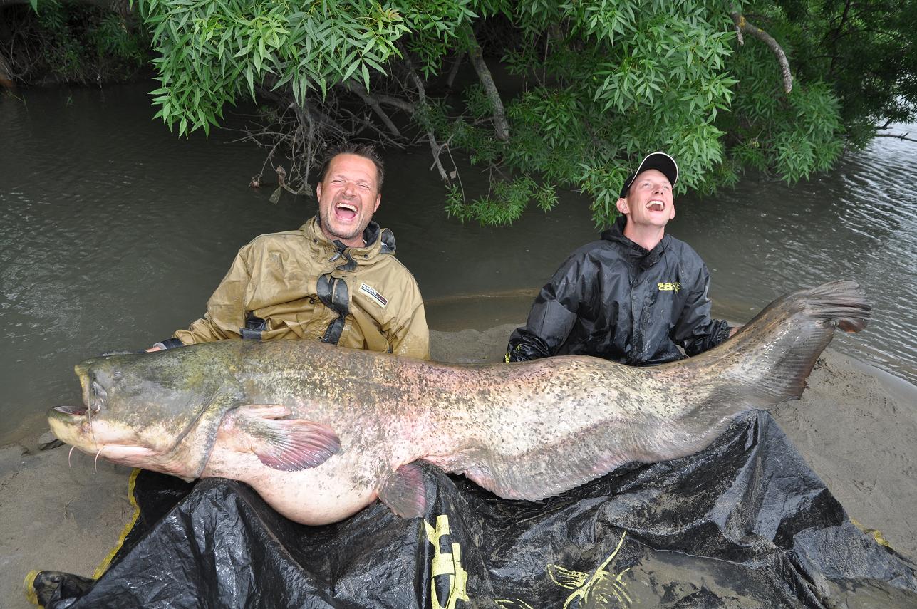 Black-Cat-Teamangler Christian Höing und Gründer von „Chris Adventure Tours“ setzt Maßstäbe: Mit seinem Angelkollegen Uli Schuppler machte er sich auf Entdeckungstour an die Petite Rhone. Für beide war es das erste Mal an diesem Gewässer, eine Tour ins Unbekannte! Und dies ausgerechnet bei extremen Bedingungen mit drei Metern Hochwasser. Es gab nur noch wenige Uferplätze und der Fluss führte viel Treibgut mit sich. Doch die beiden Anglern kämpften und wurden belohnt mit mehreren Fischen von über zwei Metern Länge. Was jedoch am letzten Tag passierte, wird beiden bestimmt noch lange im Kopf bleiben: Um 10 Uhr morgens verneigte sich eine Black Cat Freestyle-Rute bis ins Handteil und der Drill des Lebens begann für Uli Schuppler. Der Waller zog die ersten zehn Minuten von der geschlossenen Fin-Nor-Rolle Schnur, wie er wollte. Die Angler folgten dem Urviech mit dem Schlauchboot unfreiwillig. Jedoch machte der Waller nach weiteren zehn Minuten einen kleinen Fehler und er schwamm Strom auf. Nach Erfahrung der beiden Angler machen das nur Fische von über 2,40 m Länge. Genau wie dieser, der durch den Richtungswechsel seine Kräfte schnell ans Limit brachte. Nach weiteren zehn Minuten konnten sie den Waller dann endlich vom Gewässergrund lösen und ausdrillen. Als der Gigant das erste mal die Wasseroberfläche durchbrach, verschlug es den beiden den Atem ein gewaltiger Anblick! Nach insgesamt 35 Minuten auf Biegen und Brechen konnte Christian Höing den Urfisch sicher ins Boot ziehen. Nach genaueren Wiegen und Messen mit mehreren Zeugen standen die Maße des absoluten Ausnahmefisches fest: 258 Zentimeter und 122,16 Kilo – der neue französische Gewichtsrekord!