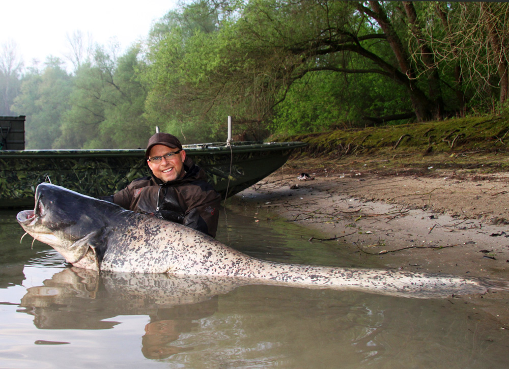 Die Wassertemperatur des Rhein bei Karlsruhe ist bereits auf über 14 Grad Celsius angestiegen und die Bartelträger sind jetzt in voller Fresslaune. Sie hauen sich alles in ihre Mägen, was ihnen vor das riesige Maul schwimmt. Diese Chance nutzte Peter Merkel, Angelguide und Teamangler bei Zebco, aus und wagte einen Ansitz auf die Uriane im Rhein. Mit einer U-Pose, und einem Tauwurmbündel als Köder, bot er seine Montage ufernah an. Lange musste er nicht warten, bis ihm ein Wels von 215 Zentimeter Länge und einem sagenhaften Gewicht von 51 Kilogramm einstieg. Nach einem kampfstarken Drill konnte Peter den Giganten aus den Fluten des Rheins ziehen. Sein bisher größter Rheinwaller hatte eine Länge von 223 Zentimeter bei 75 Kilogramm Gewicht. Damit ist er um nur acht Zentimeter an seinem Personal Best vorbei geschrammt. Peter Merkel hat sich zur Aufgabe gemacht, Waller in unseren heimischen Gewässern zu beangeln und das mit großem Erfolg, wie seine Fänge beweisen.