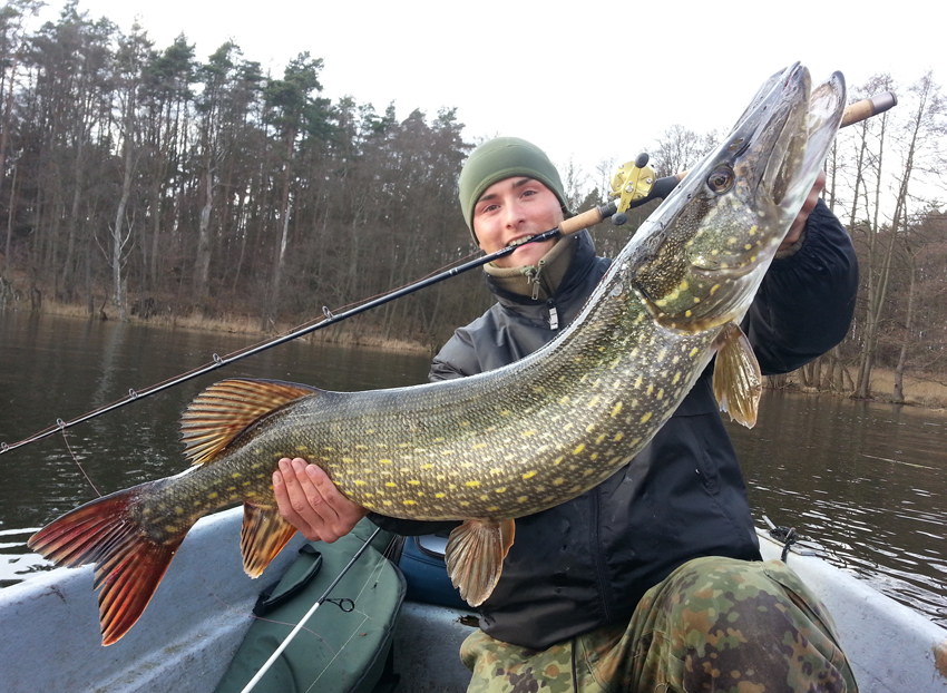 Am 1. April angelte Marcus Trinks vom Boot aus auf dem Stechlinsee in Brandenburg. Als Köder hatte er sich für einen 15 Zentimeter langen Buster Jerk von Strike Pro in der Farbe Whitefish entschieden. Auf diesen stieg eine Hechtdame ein, die einen spektakulären Drill lieferte. Doch dank seiner Baitcaster Rolle (Calcutta von Shimano) und der Piketime-Rute ließ sich der Fisch schnell unter Kontrolle bringen und sicher landen. Der Hecht hatte eine Länge von 97 Zentimetern.