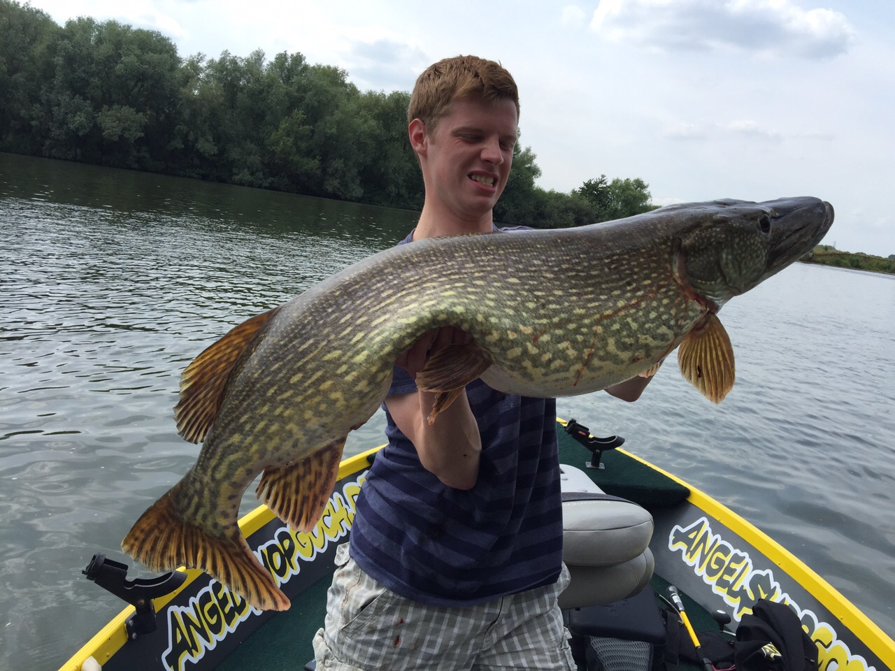 Zusammen mit seinem Kollegen Tom Peter Janßen vom Angelshop Goch schleppte Massimo Stauder die Kante zur Fahrrinne der Maas ab. Als Köder hatten die beiden ein 30 Zentimeter großes Forellenimitat von Savage Gear angeboten. Und das wurde von den Hechten goutiert. Alles begann mit einem Hecht von 113 Zentimeter für Tom. Dann folgten am Sonntag Fische von 120 für Massimo und 112 Zentimeter Länge für Tom. Am Montag stiegen dann Fische von 113 und 123 Zentimeter Länge bei Massimo auf den Riesen-Köder ein.