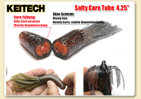Der Einsatz von Gummi-Tubes wird unter Raubfischanglern immer beliebter. Der Kunstköderversand Camo-Tackle aus Hamburg hat ab sofort ein neues Modell mit außergewöhnlichen Eigenschaften im Programm. Mit der aktuellen Lieferung von Keitech sind die 4.25″ Salty Core Tubes frisch eingetroffen. Diese, mit einem eigens von Keitech entwickelten Produktionsverfahren hergestellten, Tubes unterscheiden sich von herkömmlichen Tubes durch ihren zweischichtigen Aufbau. Durch die Verwendung unterschiedlicher Materialien und unterschiedlicher Salzkonzentrationen ist ein Köder entstanden, der neue Maßstäbe setzt. Wer sich diesen Köder einmal im Wasser angesehen hat, wird begeistert sein. Es ist davon auszugehen, dass auch zahlreiche Großbarsche, Zander und Hechte an den Tubes Gefallen finden werden. Infos und Bestellung: www.camo-tackle.de
