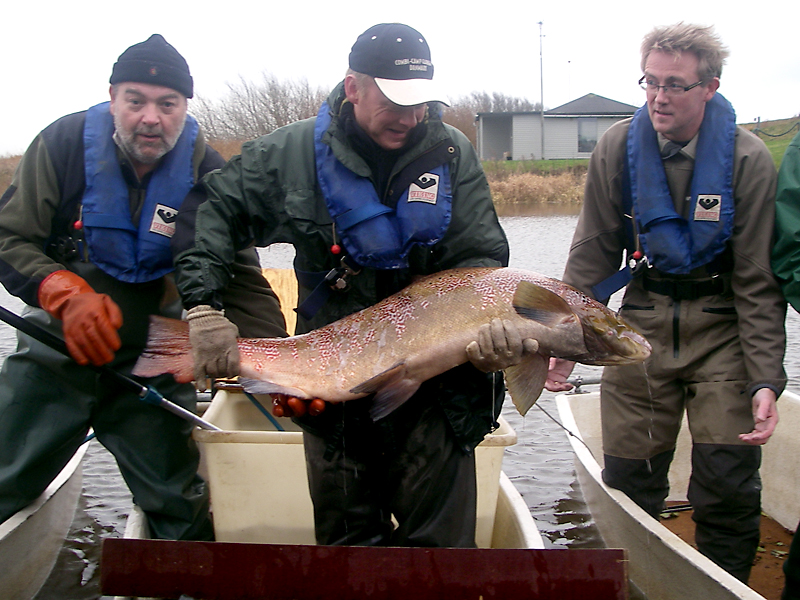Beim Elektrofischen in der dänischen Königsau fingen die Mitglieder vom Angelverein Sydvestjysk auf der unteren Strecke der Au bei Jested ein sehr großes Lachsmännchen gekleidet in der schönsten Laichfärbung. Der Lachs war nicht weniger als 120 Zentimeter lang. Da die Angler nur auf Meerforellen aus waren, ging der kapitale Salmonid wieder zurück in die Au. Eine Woche später, als die Mannschaft 25 Kilometer weiter oben bei Nielsbygaard erneut elektrisch fischte, ging derselbe Lachs noch einmal in die Falle, samt eines kleineren Bruders von 110 Zentimetern. Obwohl die Bedingungen für die freiwilligen Mitarbeiter sehr schwierig waren, fingen sie an diesem Tag immerhin 84 Lachse und 32 Meerforellen. Darunter war auch eine weibliche Forelle mit einer Länge von 84 Zentimetern. Da beim Elektrofischen drei von vier Fische ins tiefe und trübe Wasser flüchten konnten, haben die Angler später ausgerechnet, dass auf der befischten Strecke alle 100 Meter ein Lachs gestanden hat. Die Lachsstämme in den westdänischen Auen haben in den vergangenen Jahren einen unglaublichen Aufschwung erlebt. Dies ist vor allem der freiwilligen Arbeit von Angelvereinen zu verdanken. Ihre Mitglieder haben in den Flüssen Laichkies ausgebracht und Wanderhindernisse an früheren Wassermühlen und Zuchtanlagen entfernt.