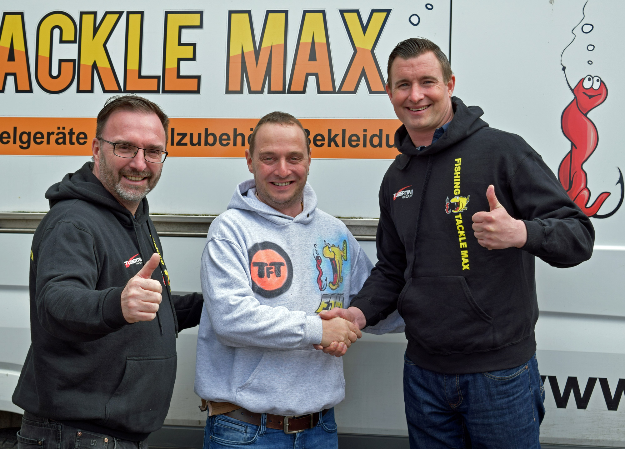 FTM-Geschäfsführer Diethard Schmiedecke (mittig) und Vertriebsleiter Jörg Iversen (links) freuen sich auf die zukünftige Zusammenarbeit mit Raubfischprofi Veit Wilde. Foto: FTM