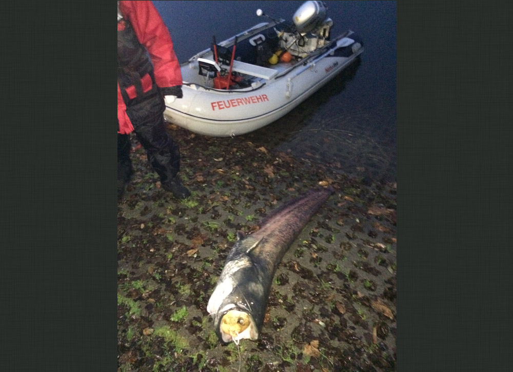 Im Zuge eines Echolot-Seminares auf dem Fühlinger See bei Köln, wurde von den Teilnehmern der Freiwiligen Feuerwehr Köln ein toter Wels gefunden. Das Kuriose daran ist, dass der Fisch eine Boje im Maul hatte und daran verendet ist.