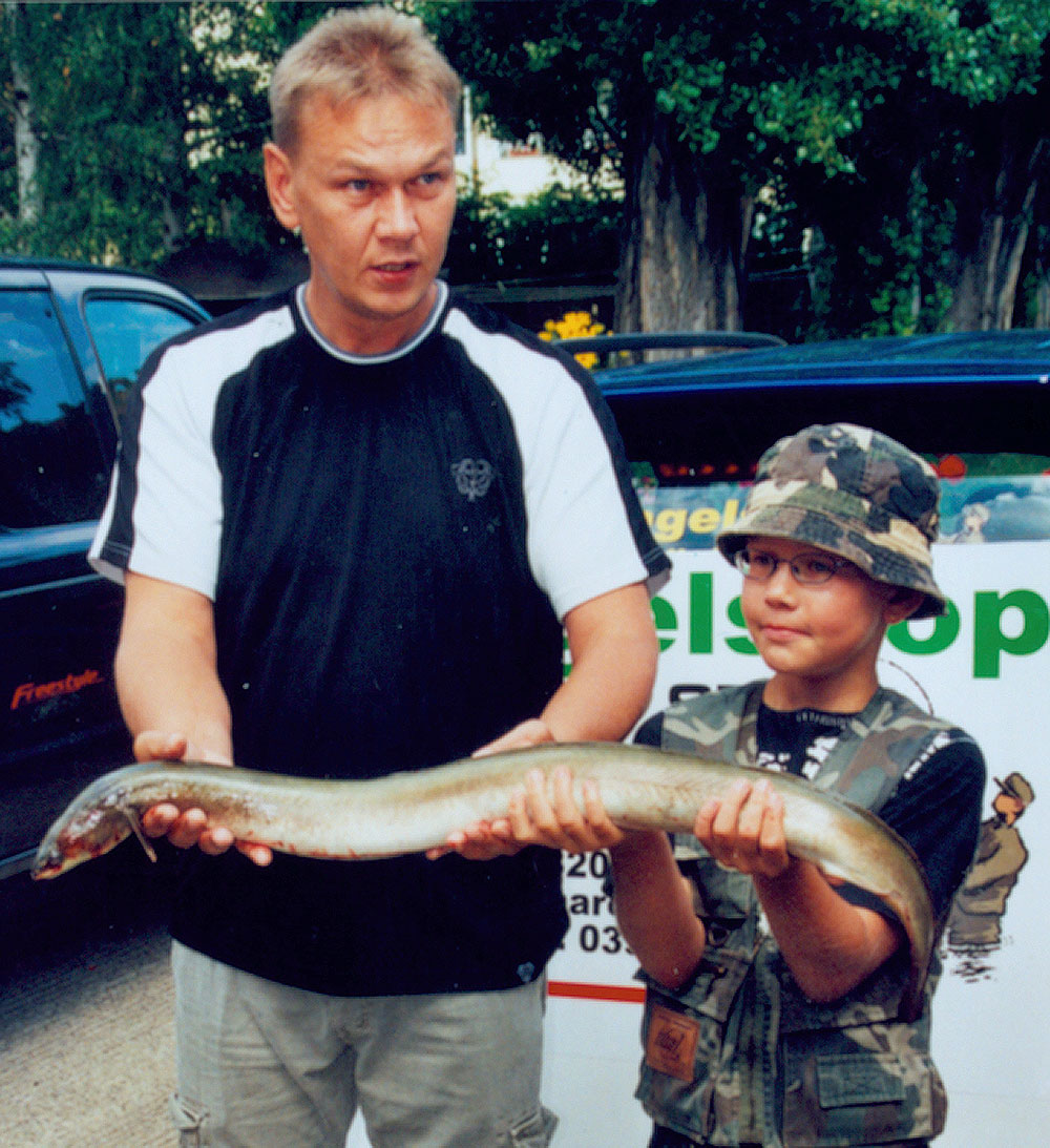 Um sicher zu gehen, dass er den Fisch nicht „verkeschert“, drückte er Christopher die Rute in die Hand und konzentrierte sich darauf, den kapitalen Aal zu landen. Die Team-Arbeit bewährte sich: Wenig später war ein toller Aal von 102 Zentimetern und fünf Pfund im Kescher. Übrigens hatte Toni den allgemein üblichen Tauwurm mit einem zusätzlichen Rotwurm garniert – ob dieses „Sonderangebot“ den Kapitalen an den Haken gelockt hat?