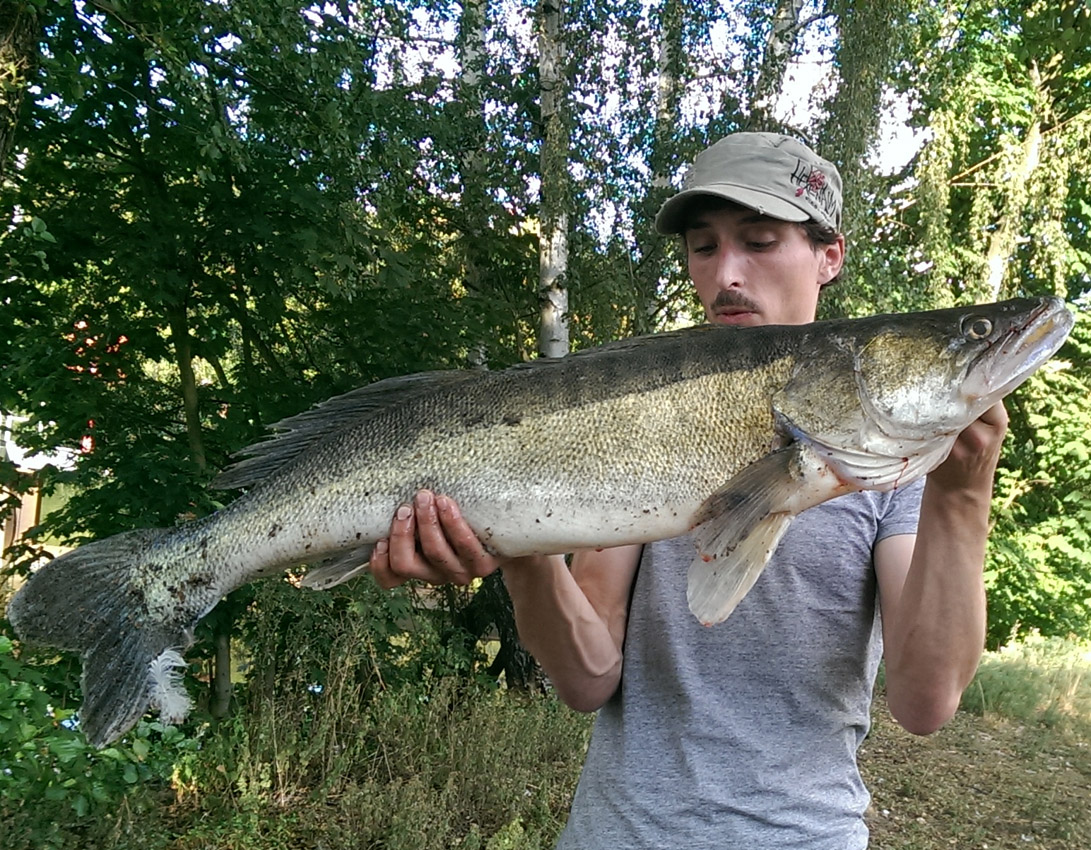 Zusammen mit seinem Kumpel Boffi verbrachte Michi Hoh einen Angeltag am Rhein-Main-Donau-Kanal. Nach einem kurzen Friedfischansitz am Morgen, packten die beiden Angler ihre Spinnruten aus und „peitschte“ vier Stunden lang das Wasser mit ihren Ködern. Kein Biss. Also zurück zur Feederrute, deren Haken Michi mit einem Kombiköder aus 4 Maiskörnern und 3 Maden bestückte. Wenig später zupfte es leicht an der Spitze der Feederrute, Nach dem Anhieb, spürte Michi sofort kräftigen Widerstand, und der Fisch legte eine tolle Flucht hin. Zuerst glaubten die beiden, einen Karpfen gehakt zu haben. Knapp 30 Minuten dauerte der Drill am doch relativ leichten Geschirr, bis Boffi einen riesigen Zander keschern konnte. Ein Zander auf eine Mais-Made-Kombi? Das gibt´s wohl nur einmal im Leben. Der Stachelritter hatte eine Länge von 99 Zentimeter.